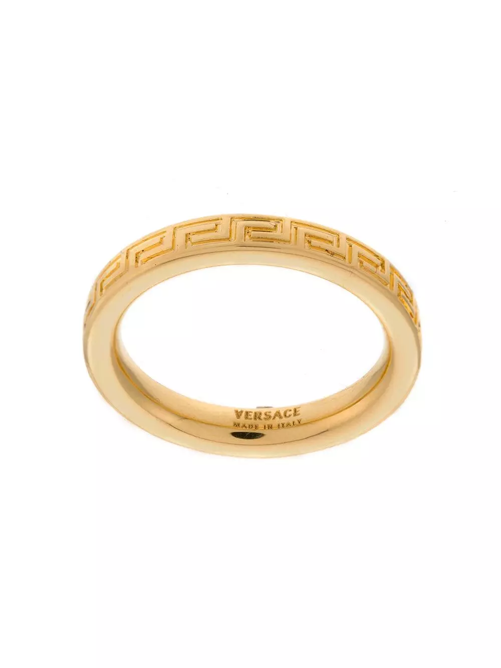 Your jewellery introduces you before you even speak. Crafted from brass and decorated with an engraved Greek Key motif, this gold-tone band ring from Versace is set to make a great first impression. We all know we never get a second chance at that – so you should grab this one. Featuring an engraved logo and a thin band.