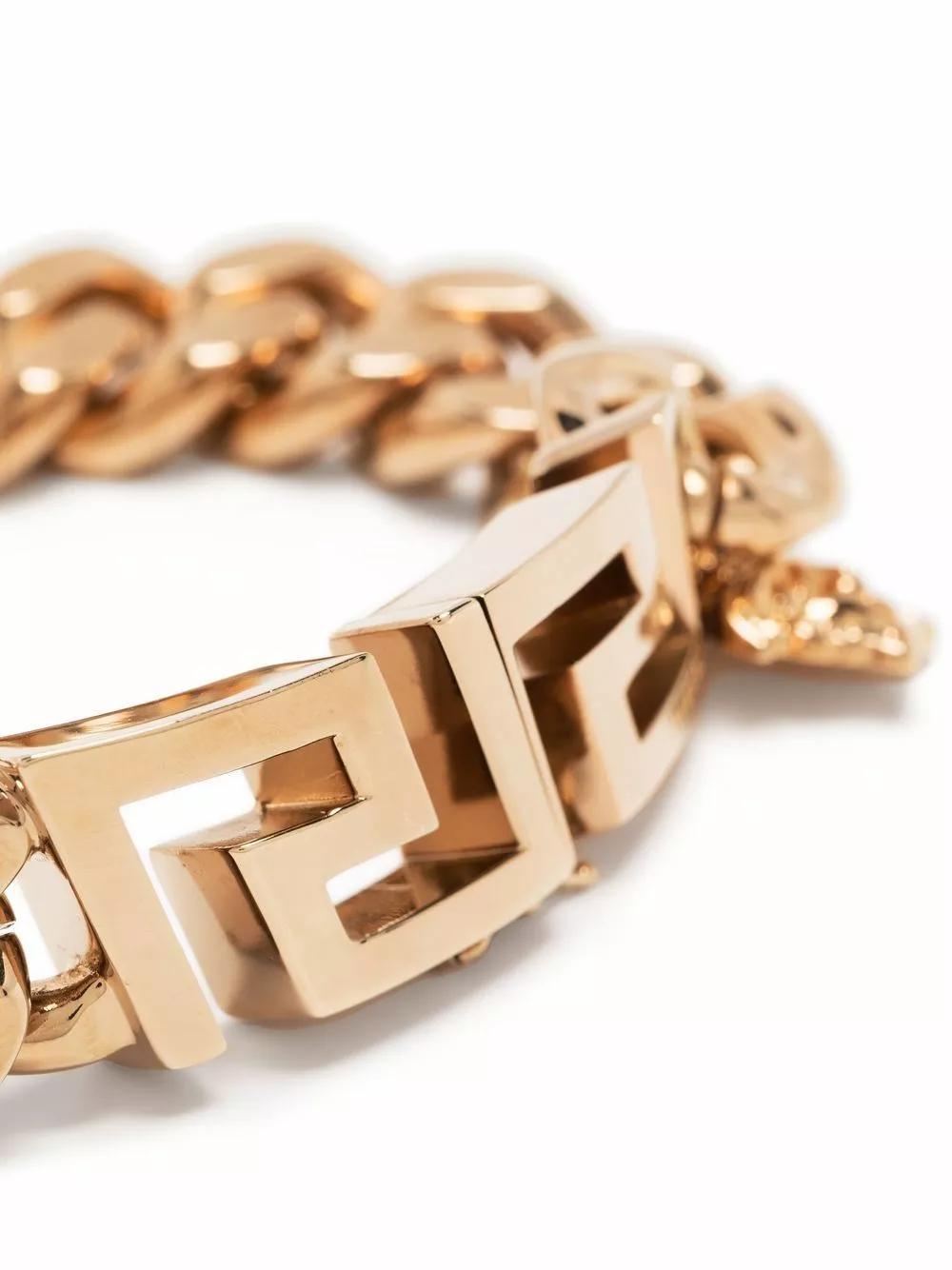 A signature motif from Gianni Versace’s childhood, the heritage Italian fashion house utilises the Medusa head logo – in this unisex bracelet – as a delicate charm detail that suspends from a chunky chain bracelet. The versatile piece also features logo-engraved La Greca hardware.