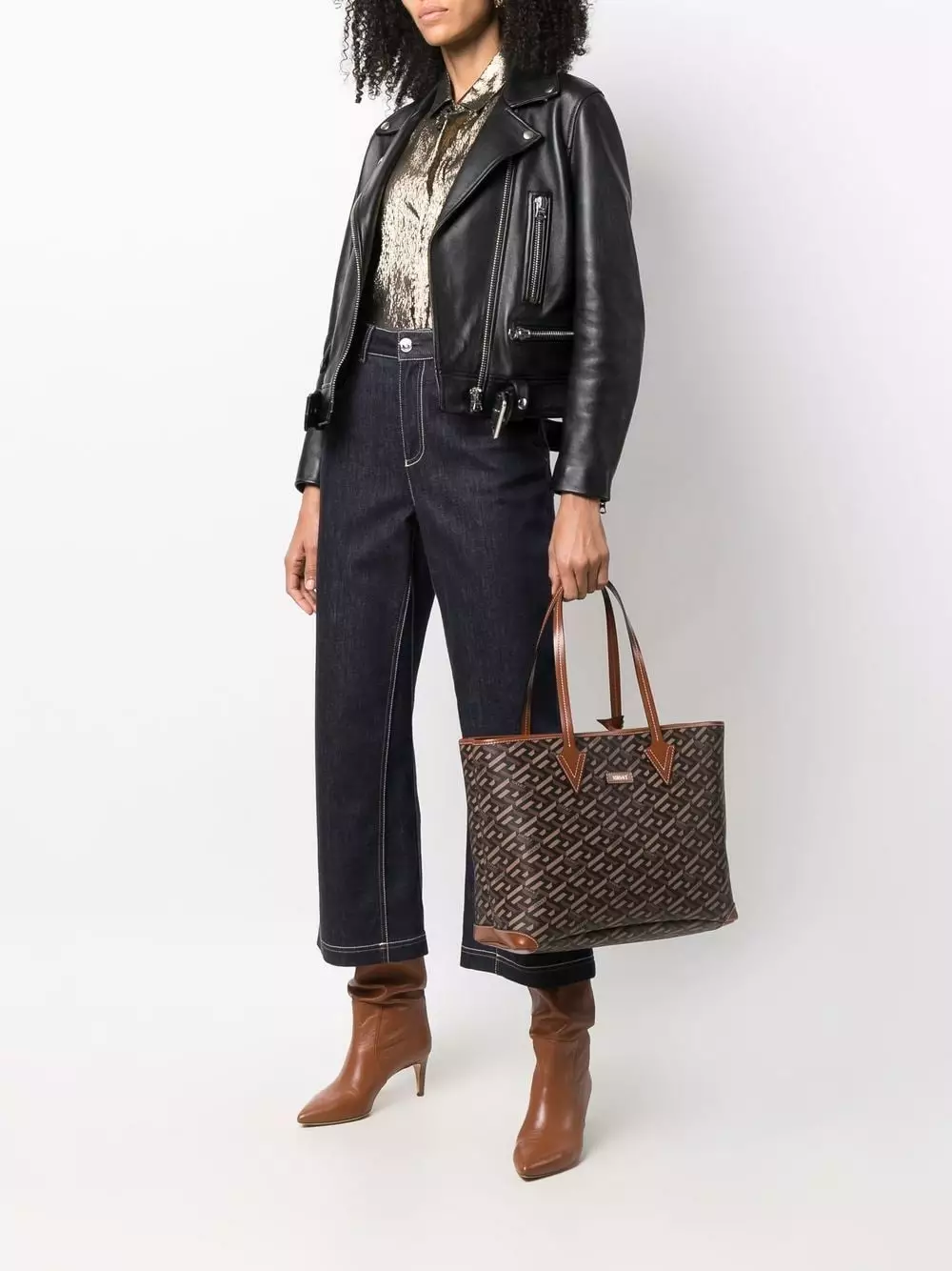 Versace’s tote aligns with the brand’s bold aesthetic. It’s accented with the striking La Greca print – a 3D update of the house’s iconic Greek Key motif.