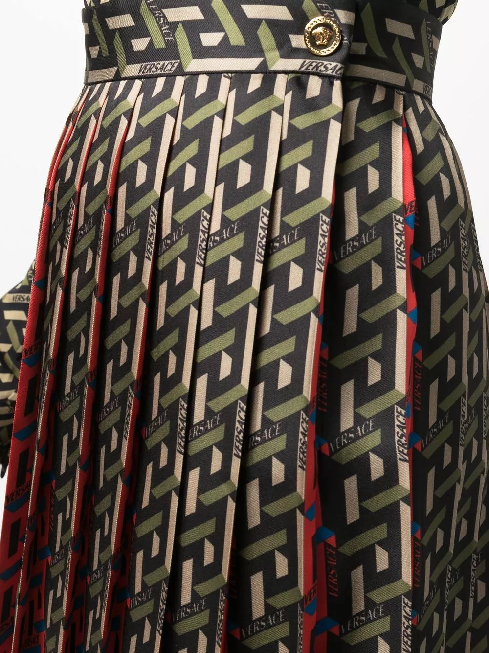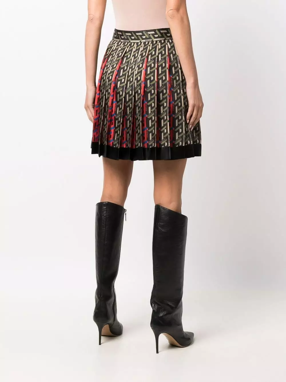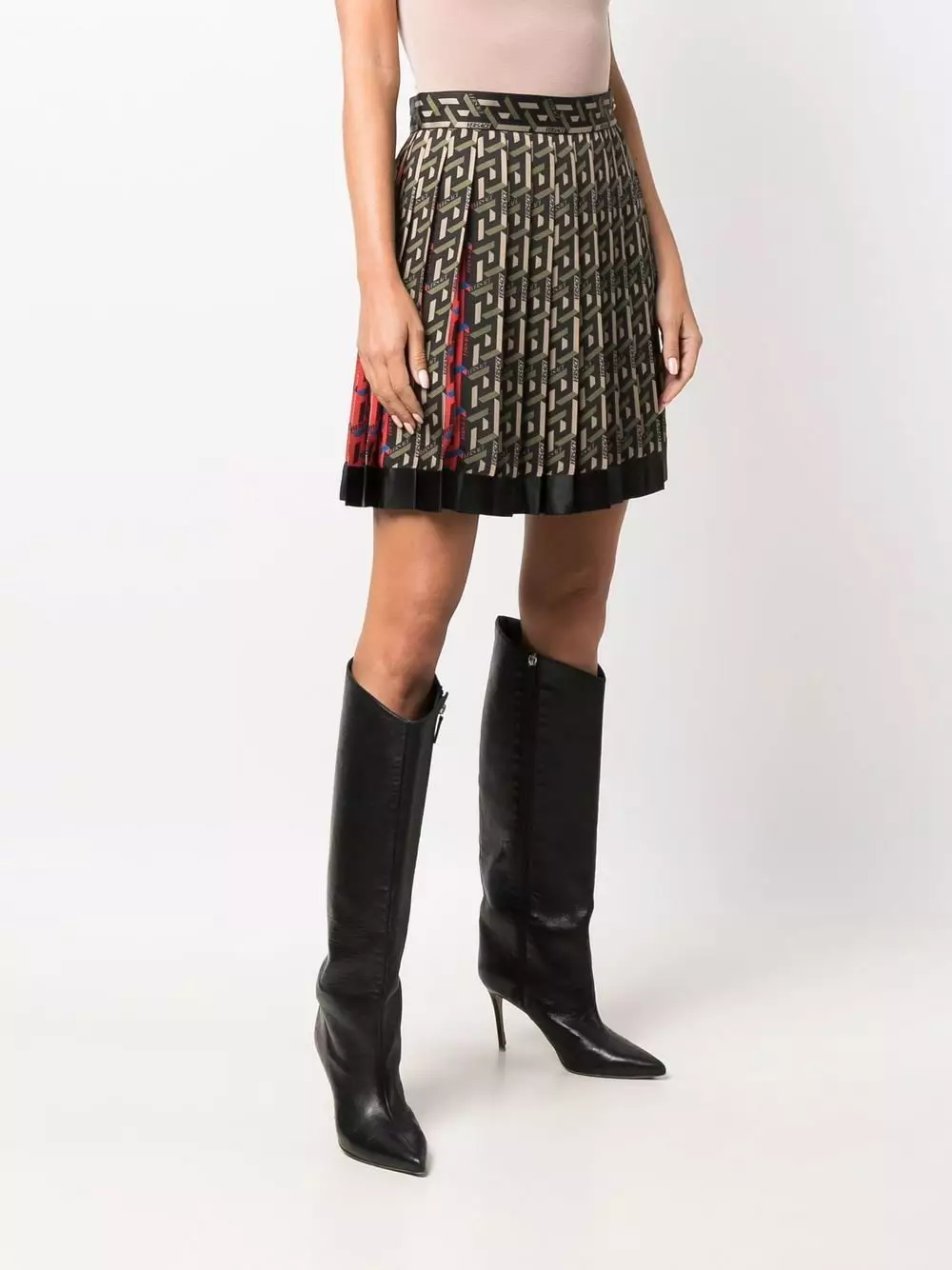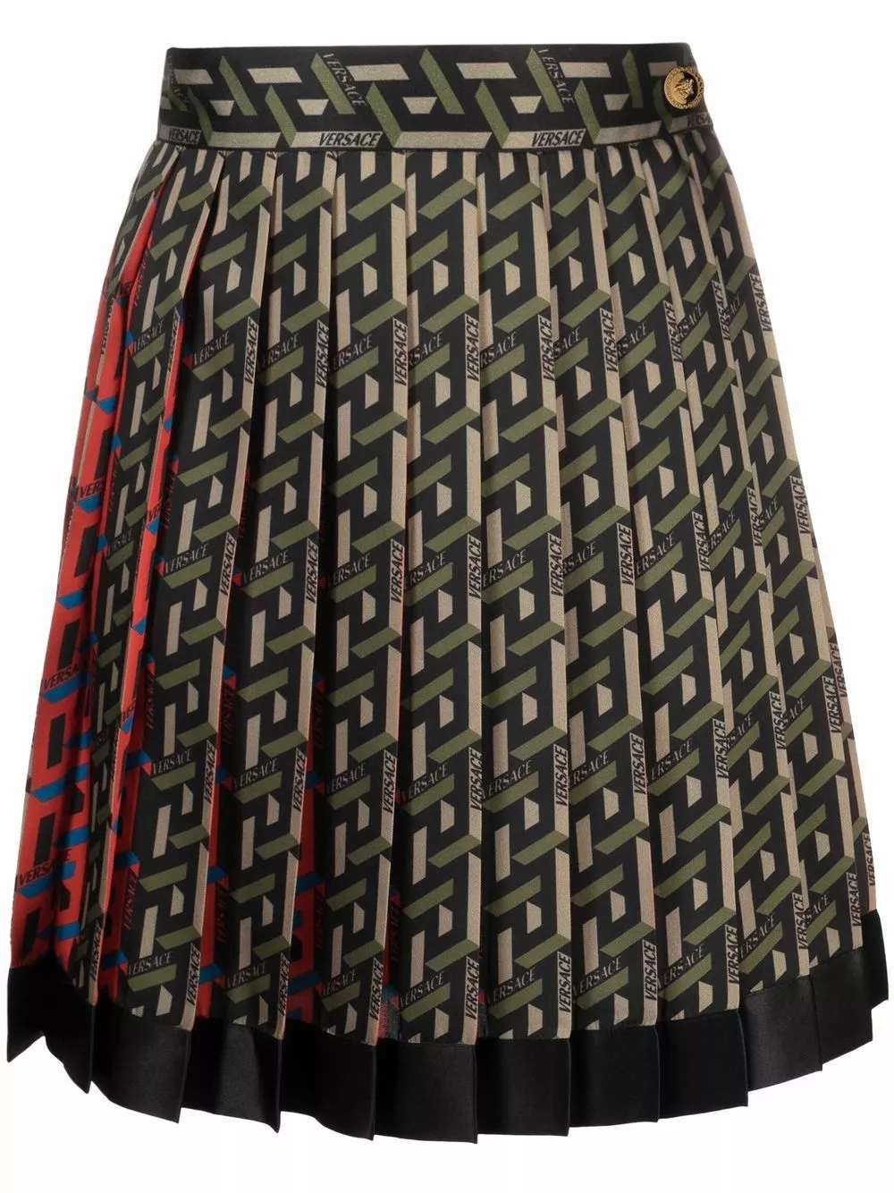 Versace’s miniskirt showcases the brand’s bold aesthetic. Cut from lustrous silk, it’s decorated with the La Greca motif – a 3D update on the label’s recognisable Greek Key emblem.