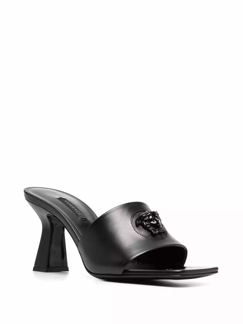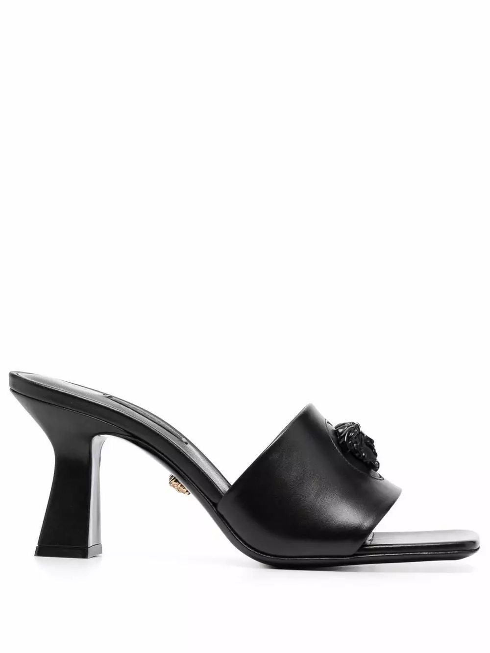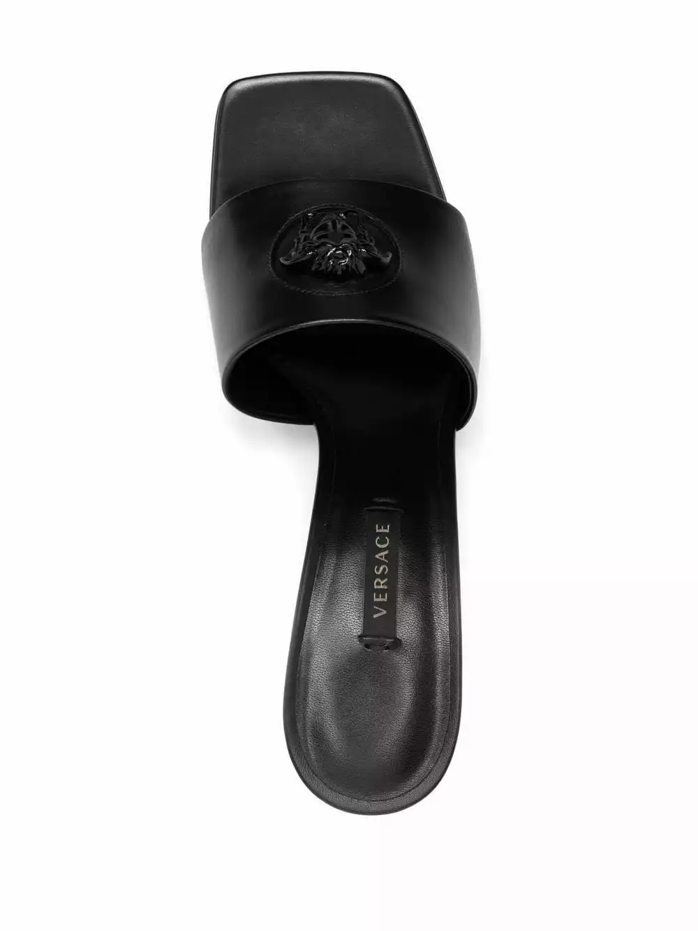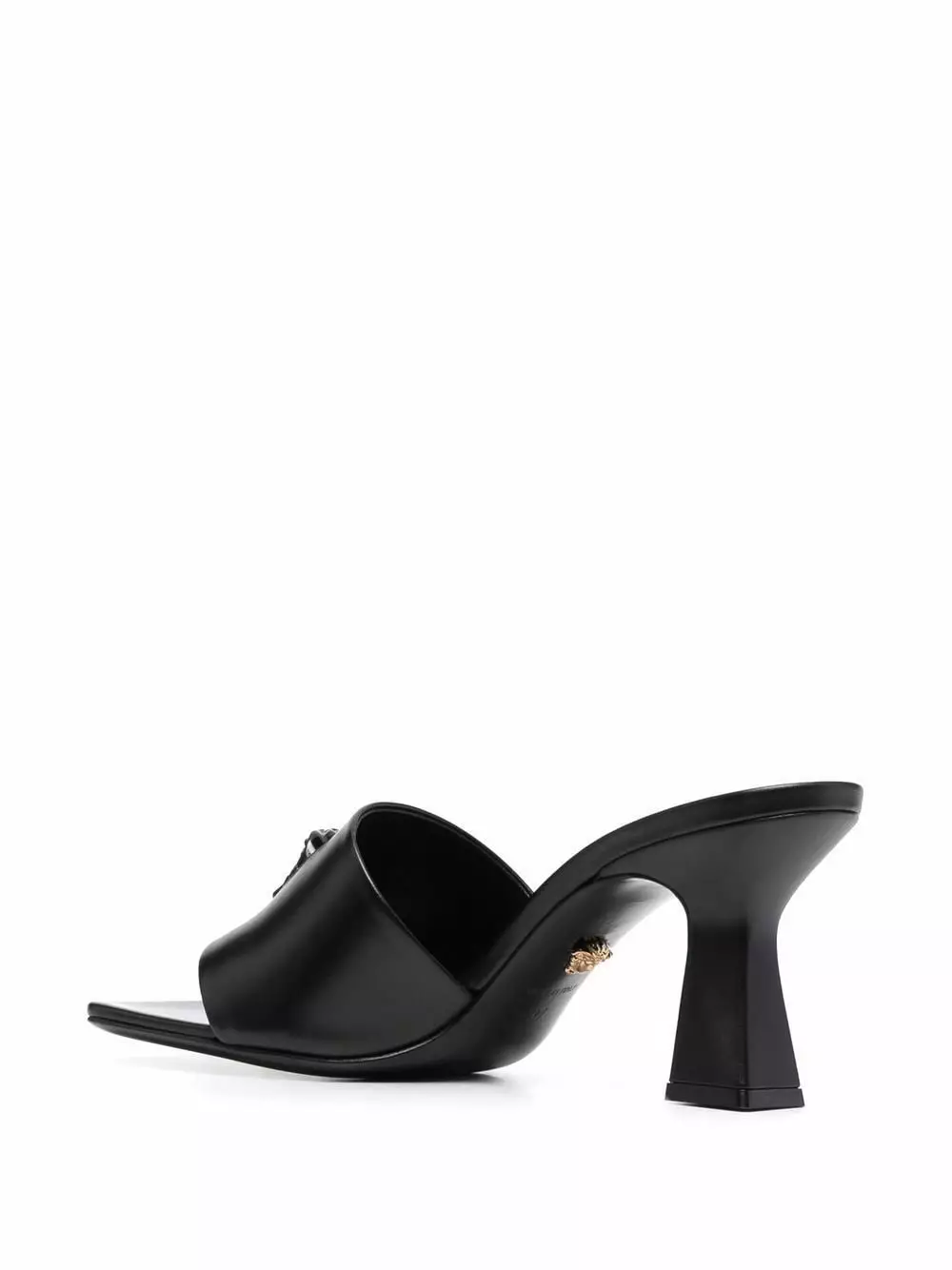 Almost synonymous with Versace’s name, a tonal stone-face Medusa Head adorns the strap of these all-black leather mules. Am iconic addition to your footwear collection.