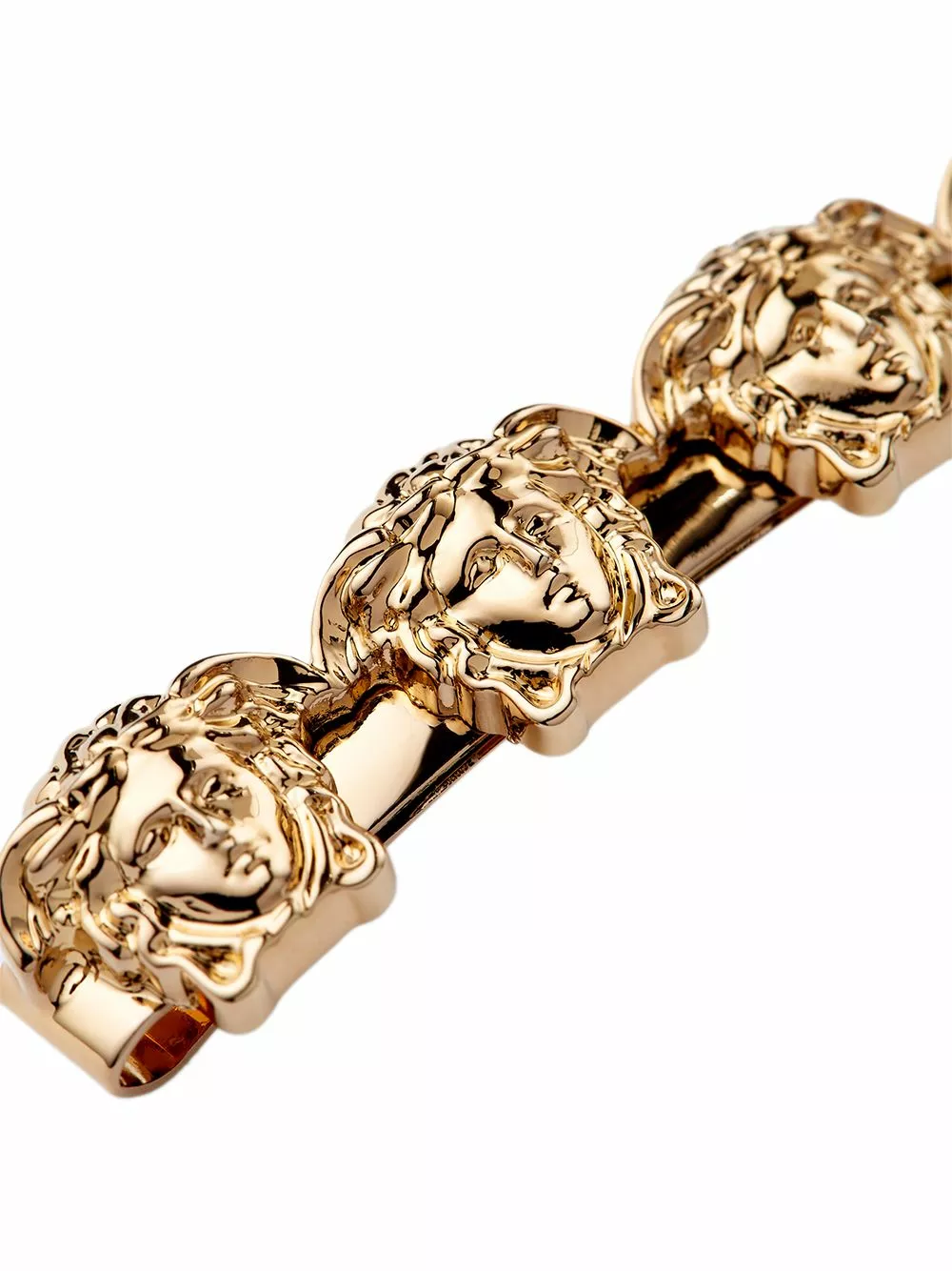 Embellished with a Medusa head motif, the same that embellishes the doors of Versace’s first Milanese headquarters, this gold-tone hair pin is part of the brand’s AW21 and seamlessly blends heritage and streetwear.