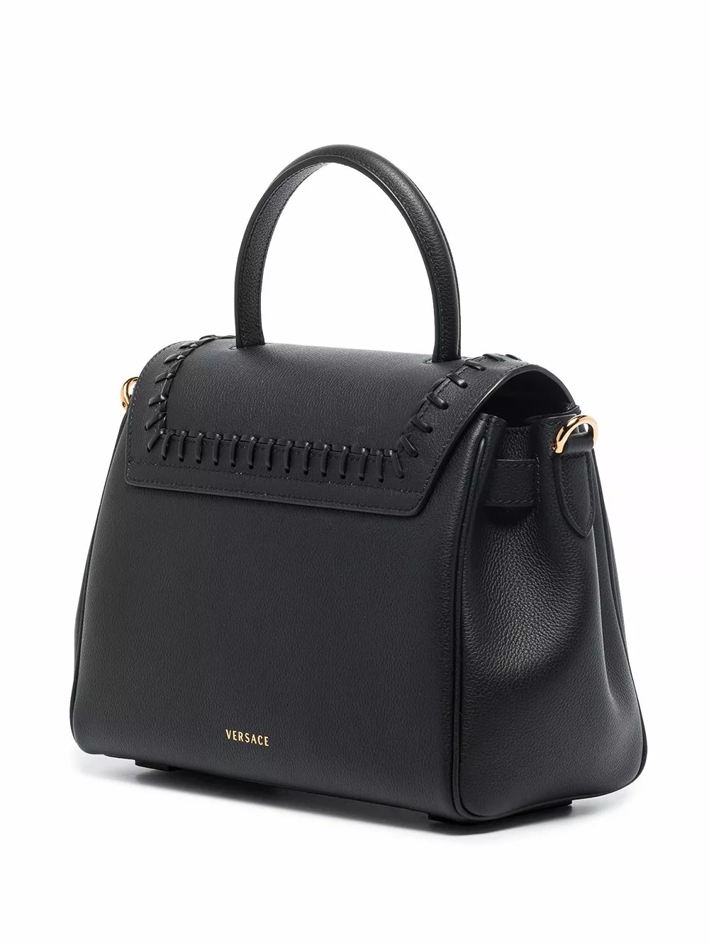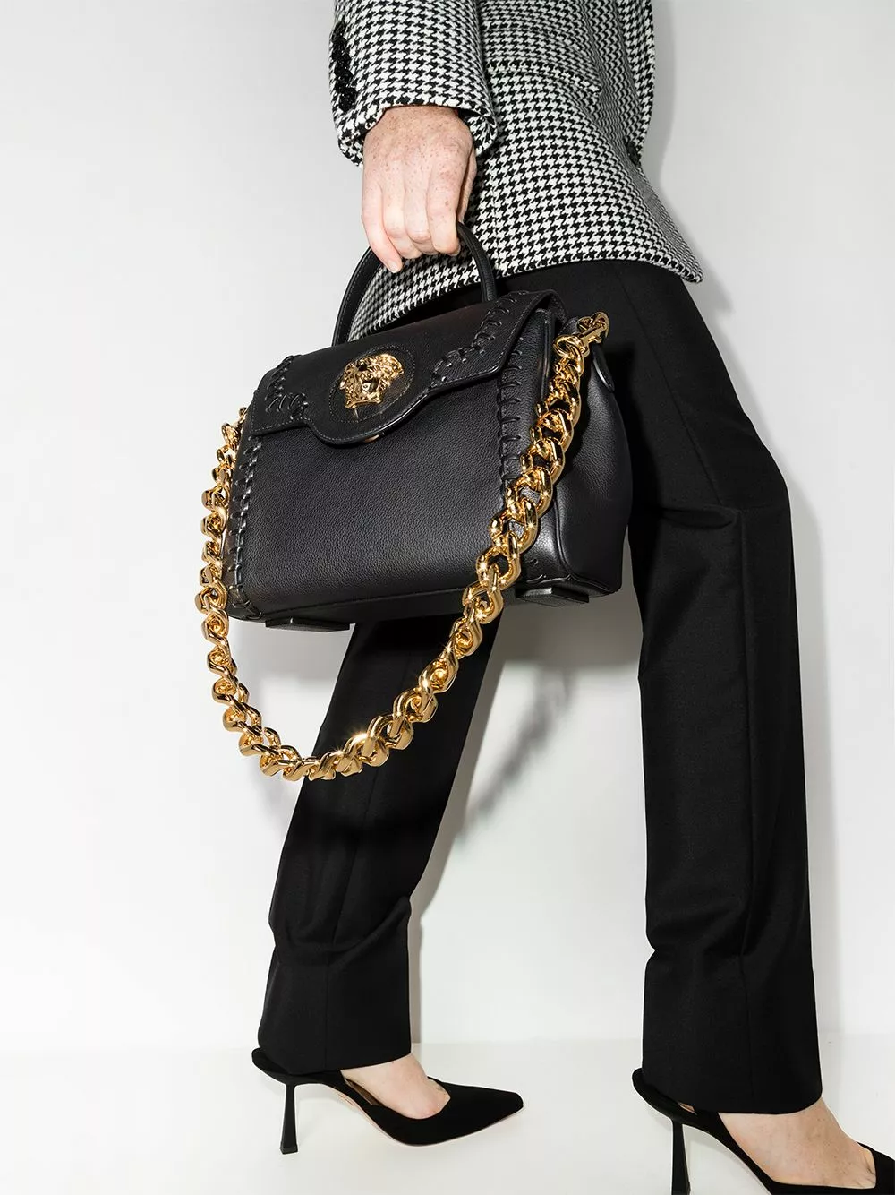 Crafted in Italy from premium leather, Versace’s latest tote bag is adorned with a Medusa plaque – the same motif that was found on the doors of the brand’s first headquarters in Milan. The structured silhouette can be styled on the wrist or across the shoulder, featuring a detachable chain-link shoulder strap and a top handle.