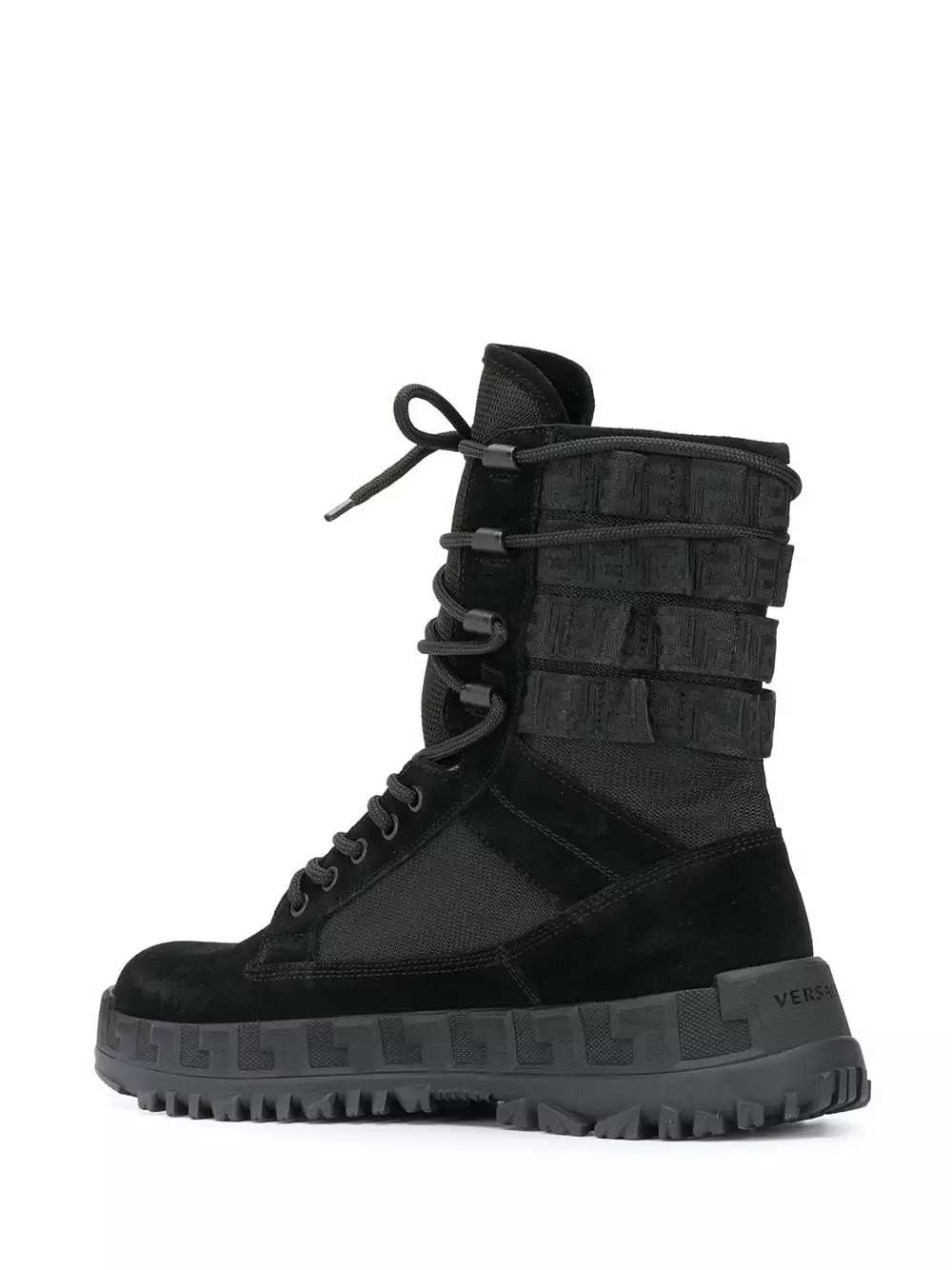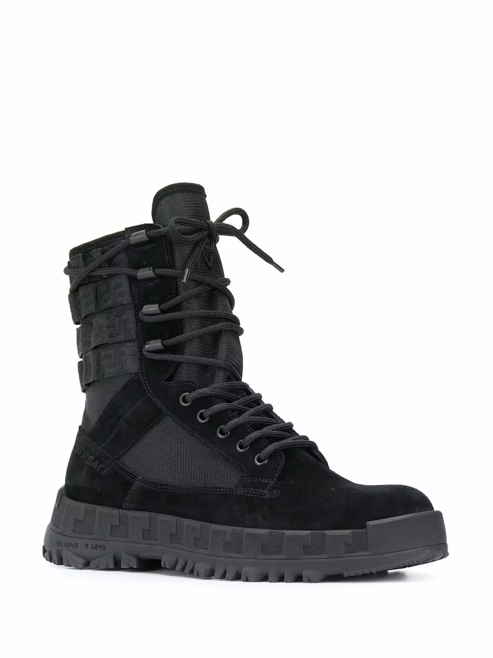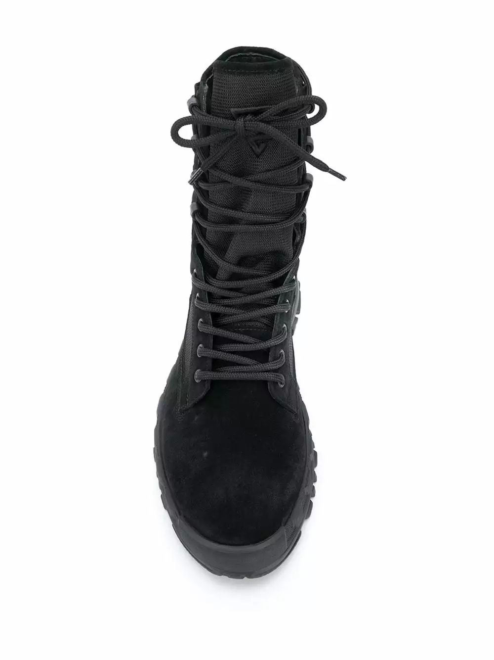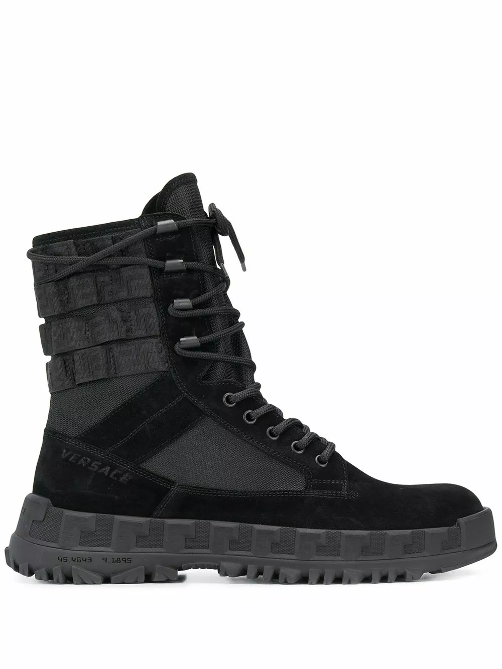 Stomp away in these Vesace combat boots. Made from black leather with suede trims, they’re a chic choice. Step it up. Featuring a lace-up front fastening, a round toe, a ridged rubber sole and suede trims.