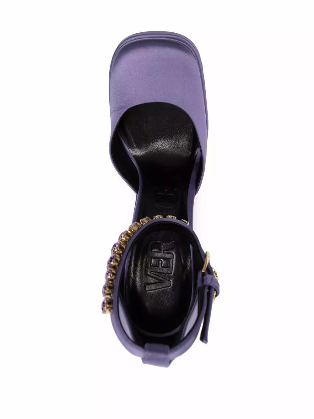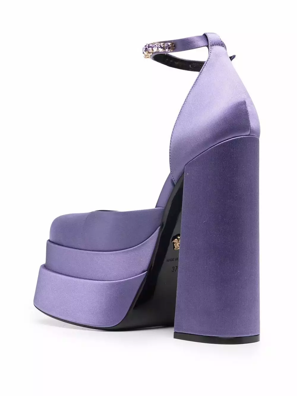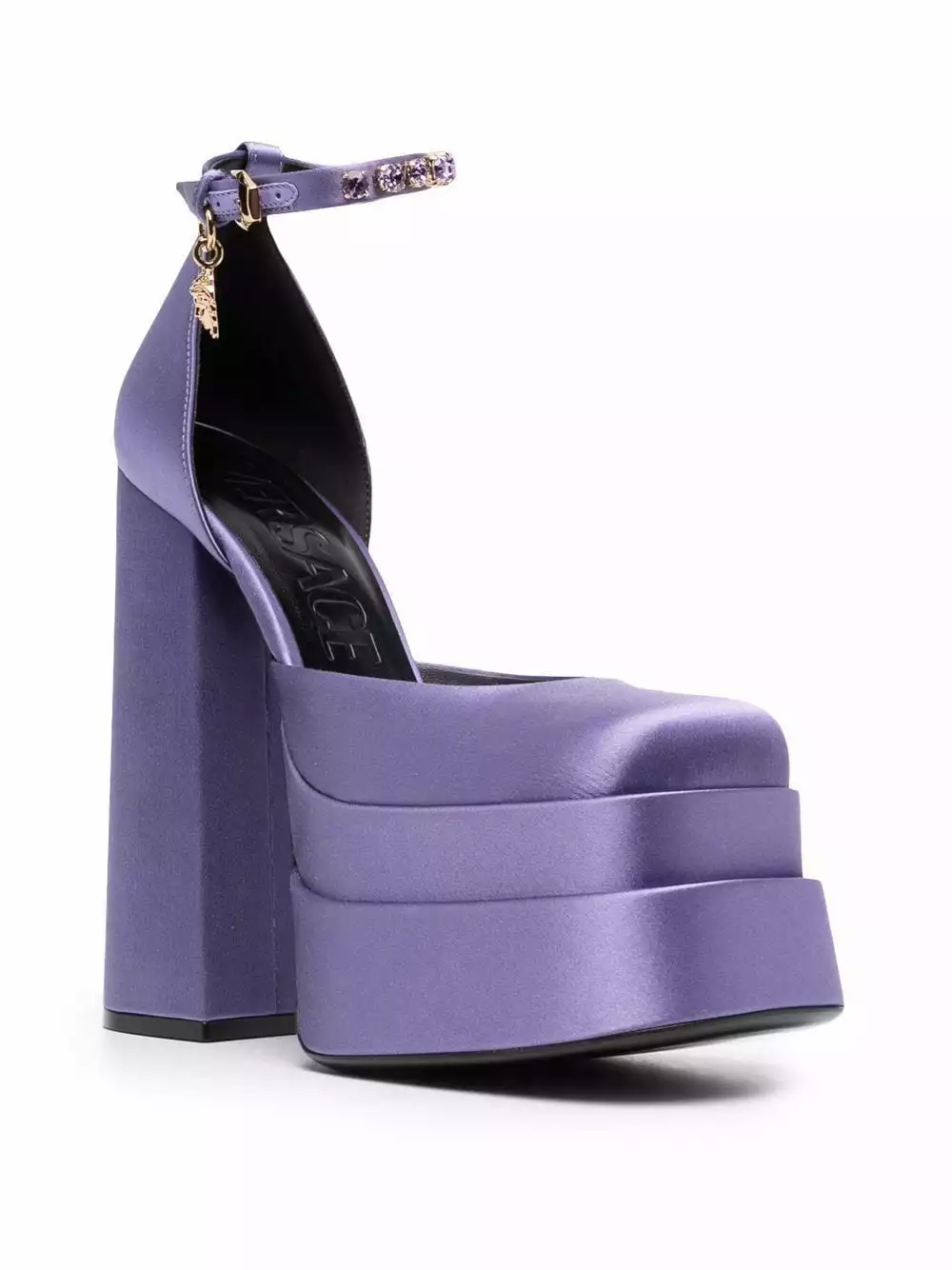 Versace’s Medusa Aevitas pumps are a statement-making option for evening dressing. Set on a double platform with a towering block heel, this purple satin iteration is finished with a Medusa charm and a row of shimmering rhinestones.