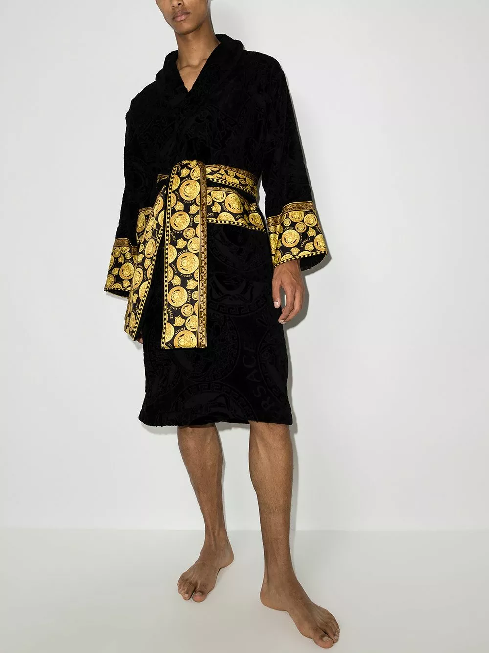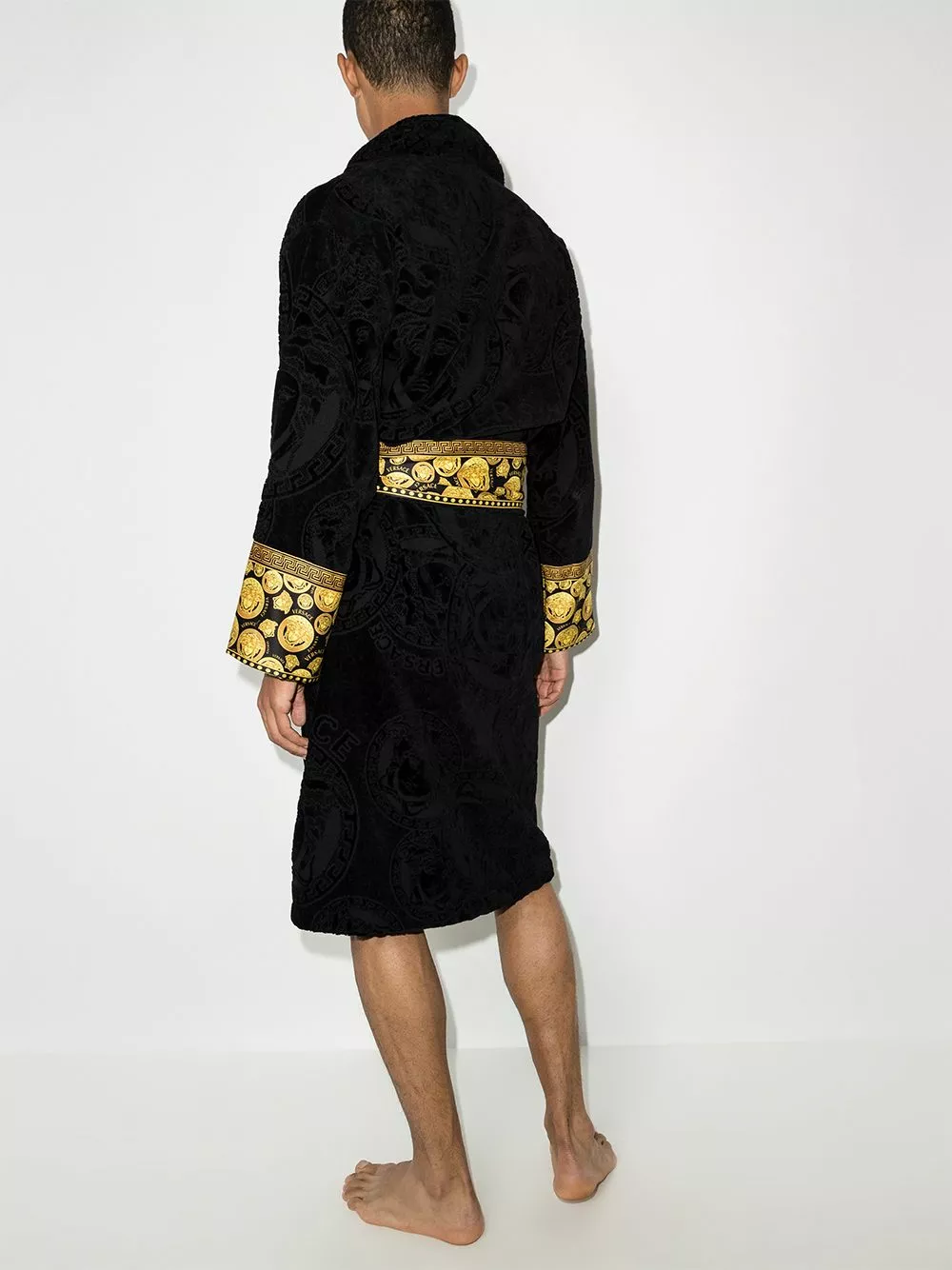 Adorned with the house’s Medusa Amplified print, Versace’s iconic bathrobe is displayed for AW21 in a black iteration crafted from soft cotton in a towelling finish. Belted at the waist, it is cut for an oversized fit and finished with gold-tone trimming.