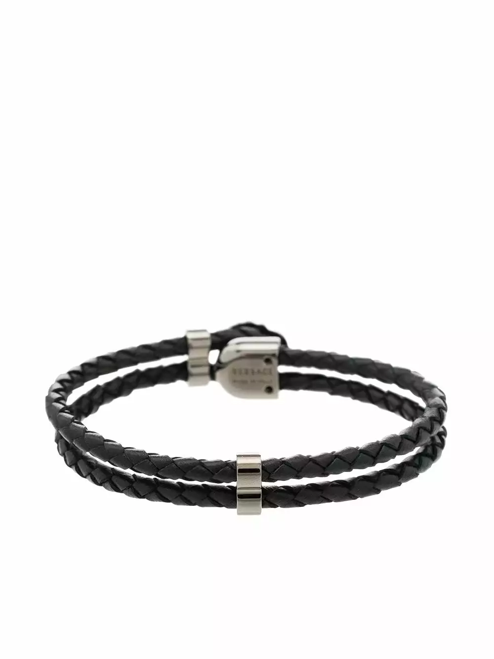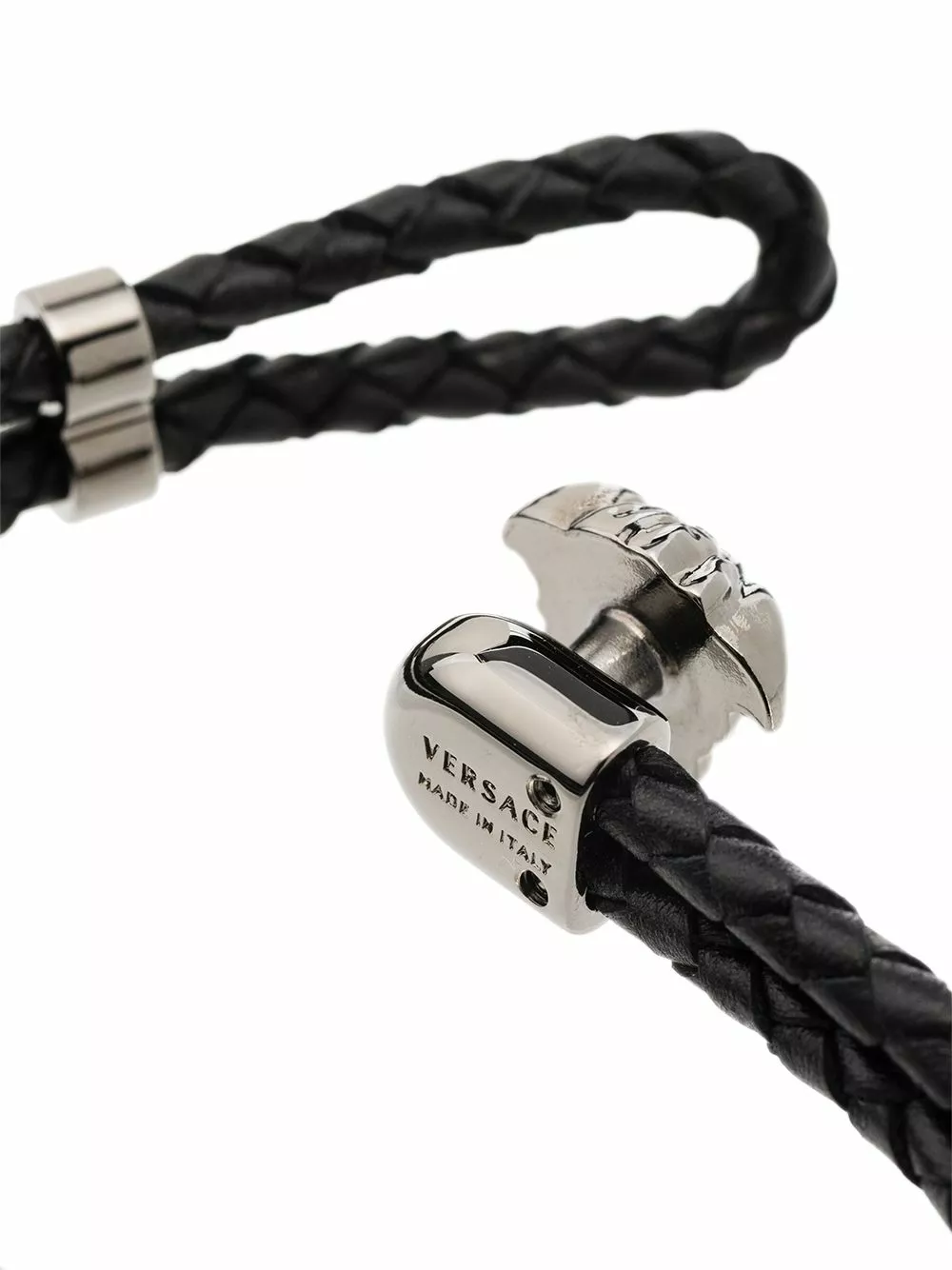 Woven black leather forms the matte straps of Versace’s rope Medusa bracelet, and silver-tone hardware marks the sliding closure of this accessory.