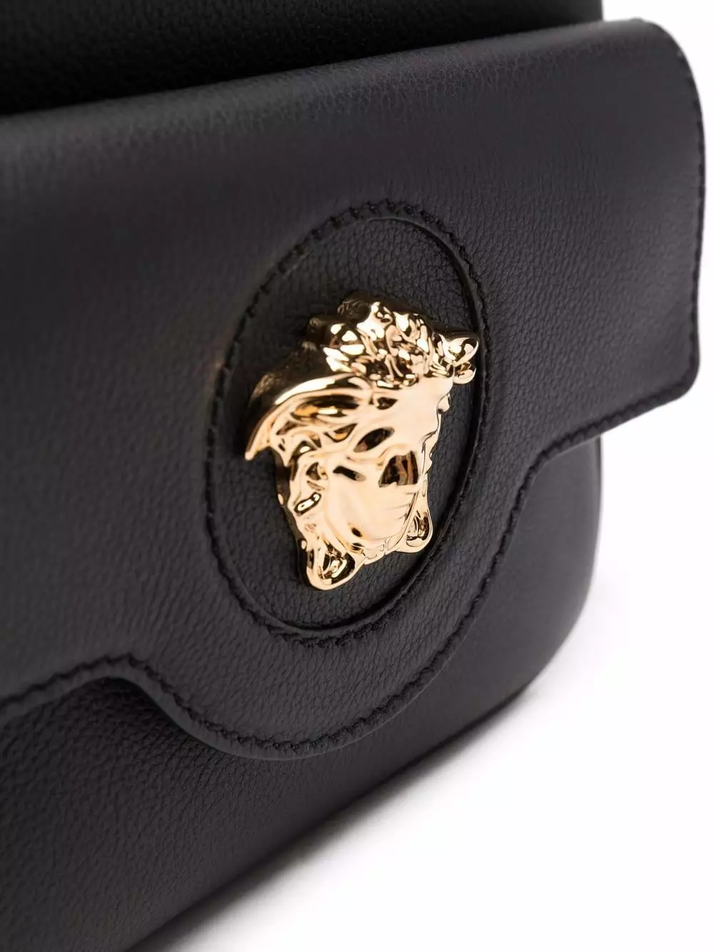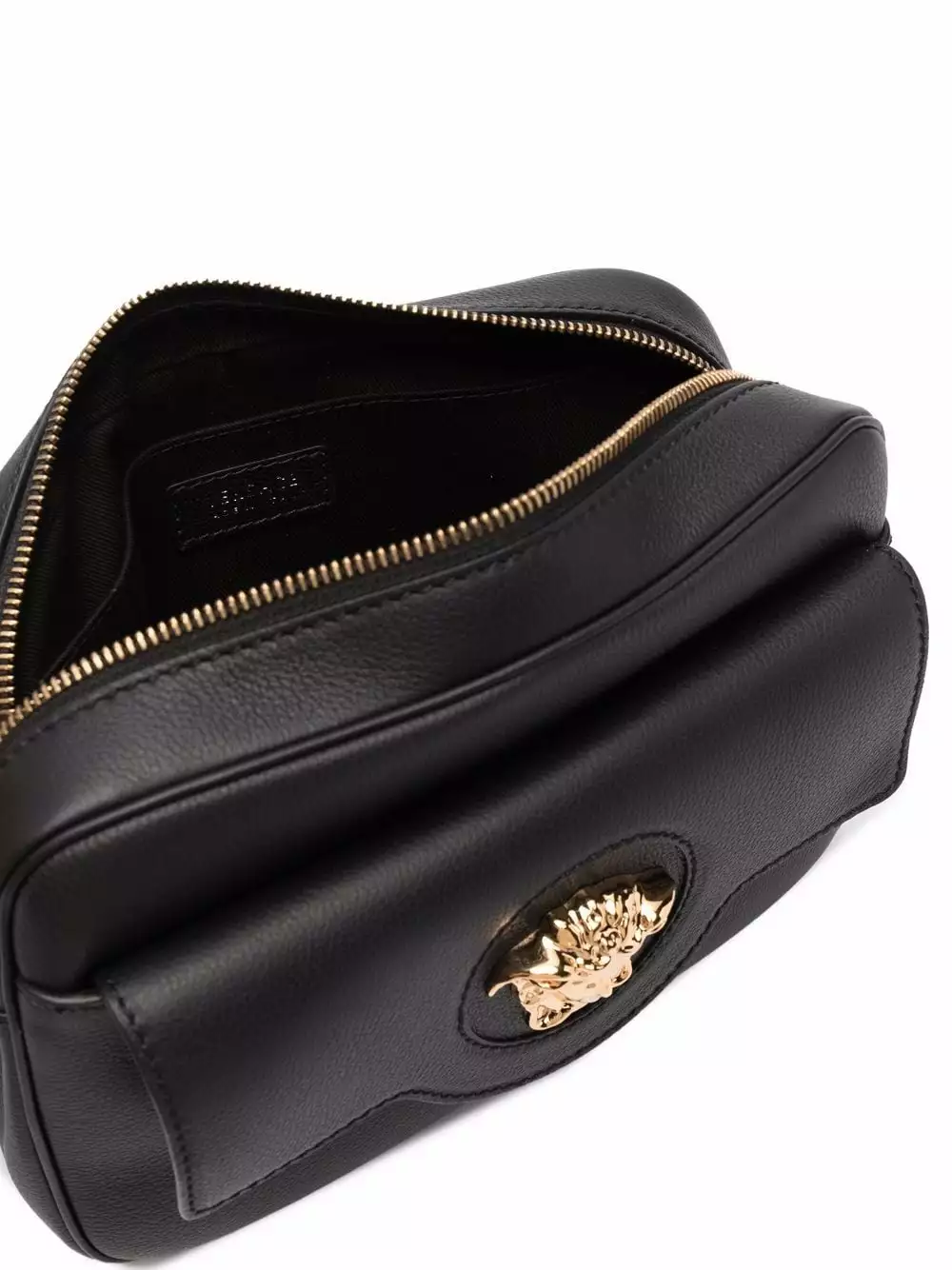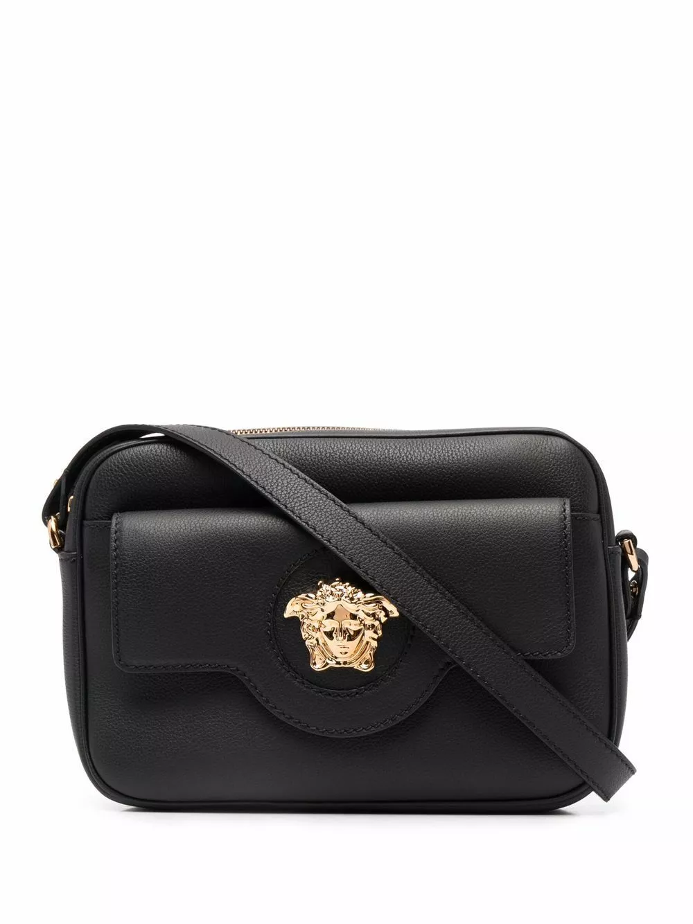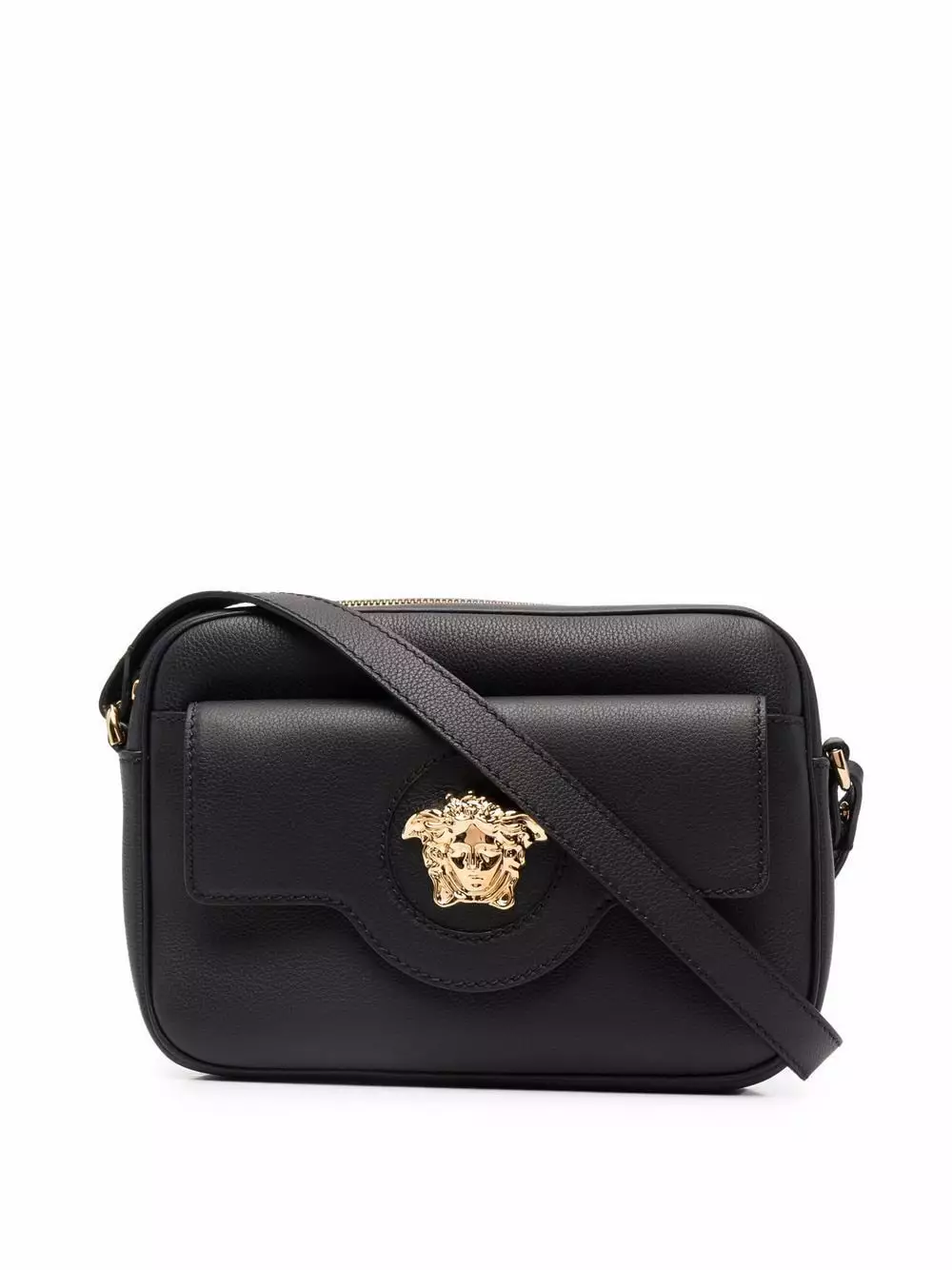Versace’s most iconic Medusa motif was inspired by ruins on the floor of the area of Reggio Calabria in Italy where the Versace children played as kids. Crafted in black leather, this crossbody silhouette has been fabricated in Italy and features a front flap compartment and central zipper compartment.