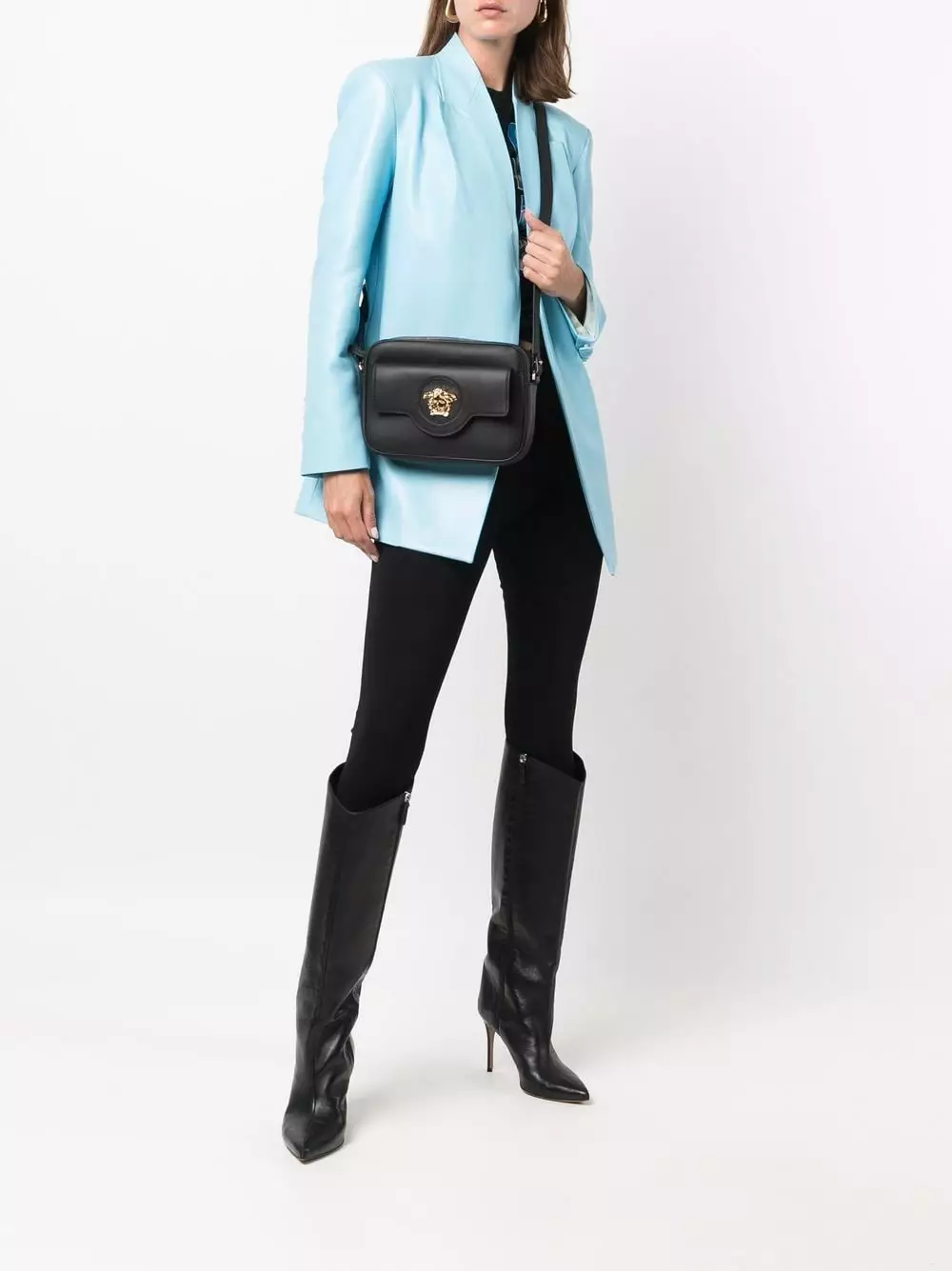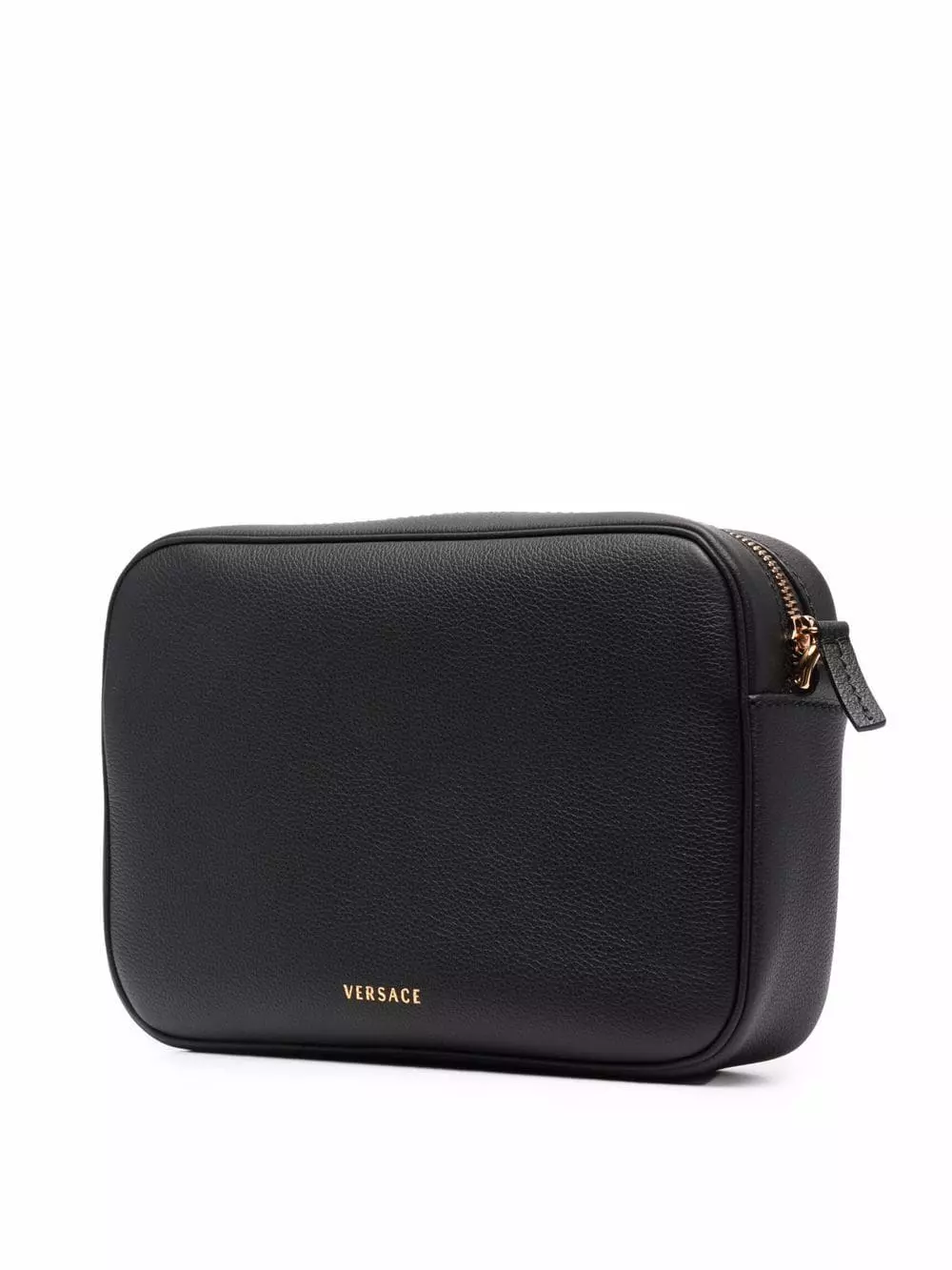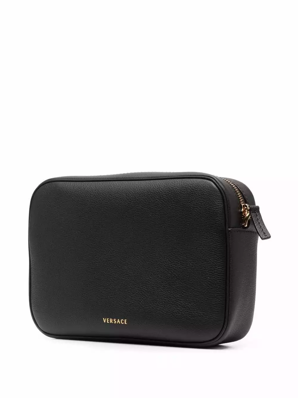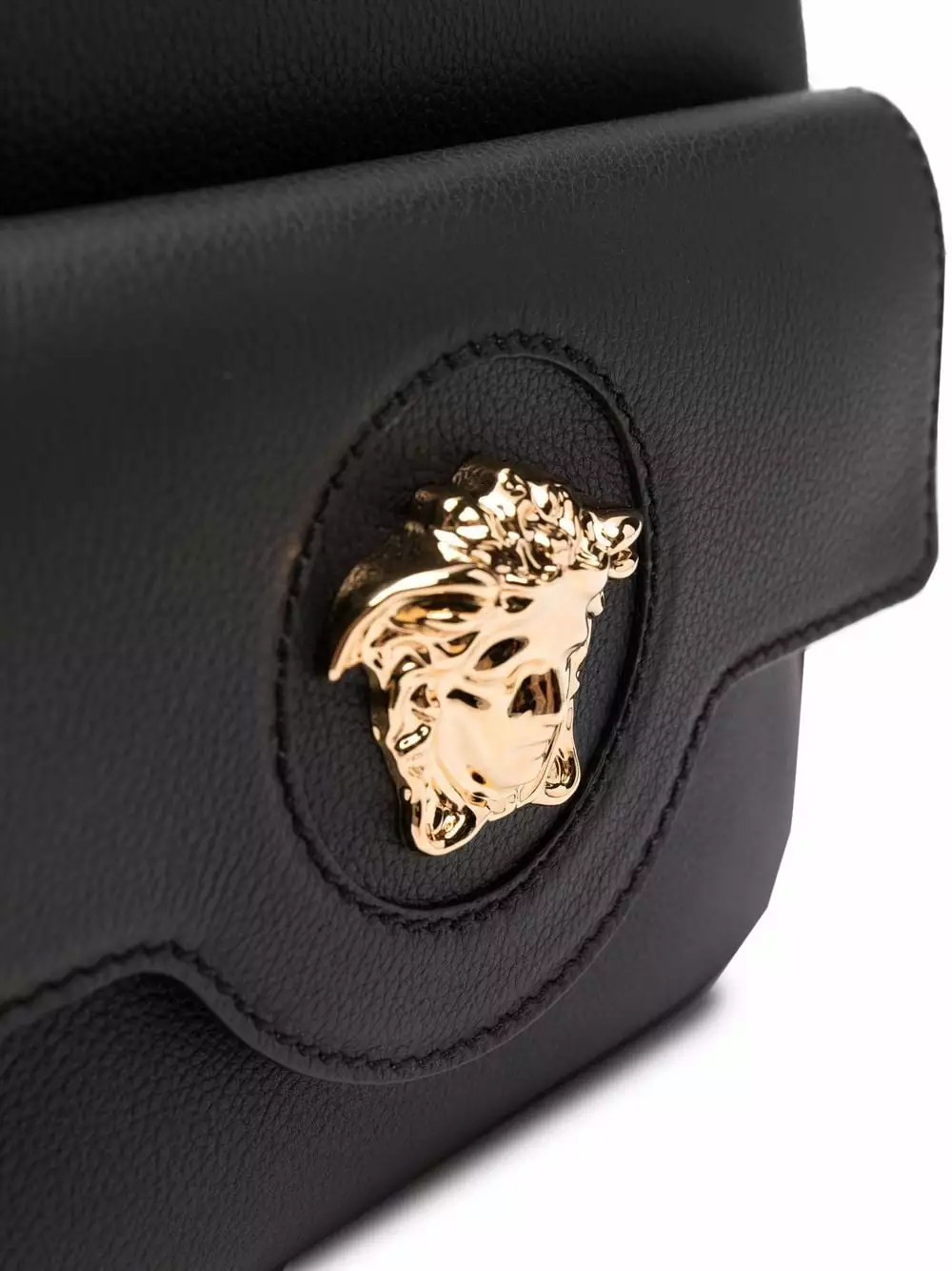 Versace’s most iconic Medusa motif was inspired by ruins on the floor of the area of Reggio Calabria in Italy where the Versace children played as kids. Crafted in black leather, this crossbody silhouette has been fabricated in Italy and features a front flap compartment and central zipper compartment.