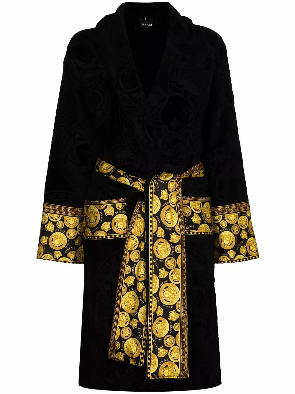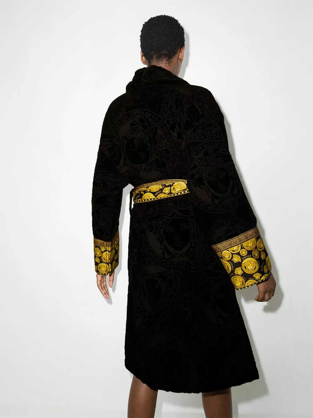 Versace’s robe is decorated with the brand’s iconic Medusa motif at the cuffs and waist. The emblem first appeared on the doors of the House’s first headquarters in Milan.