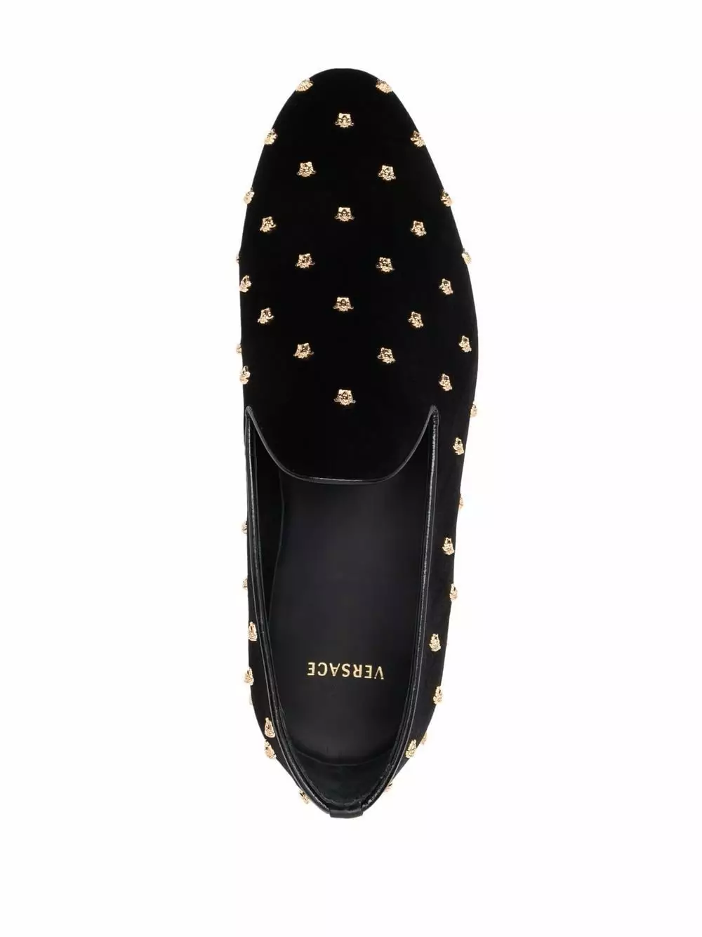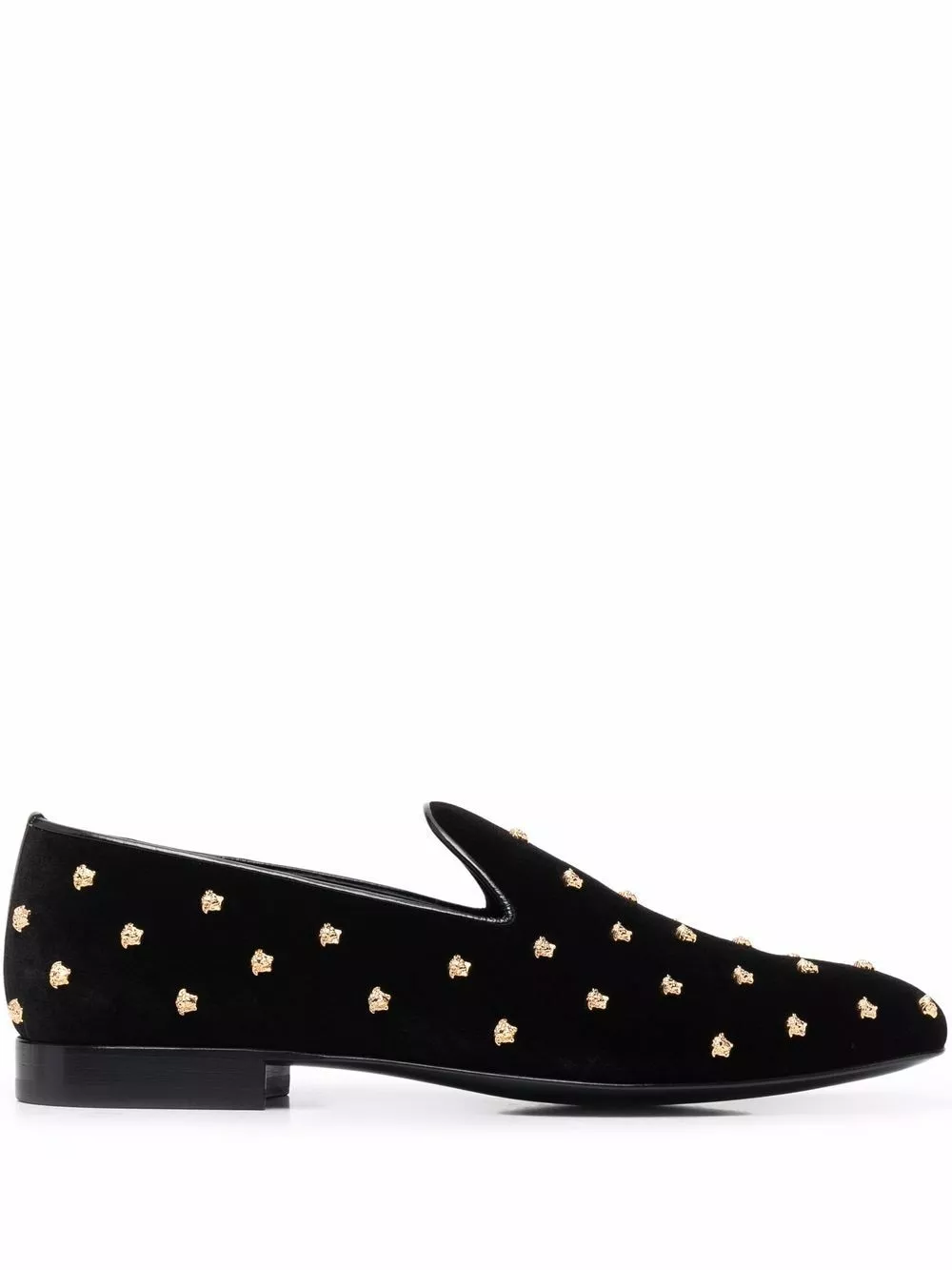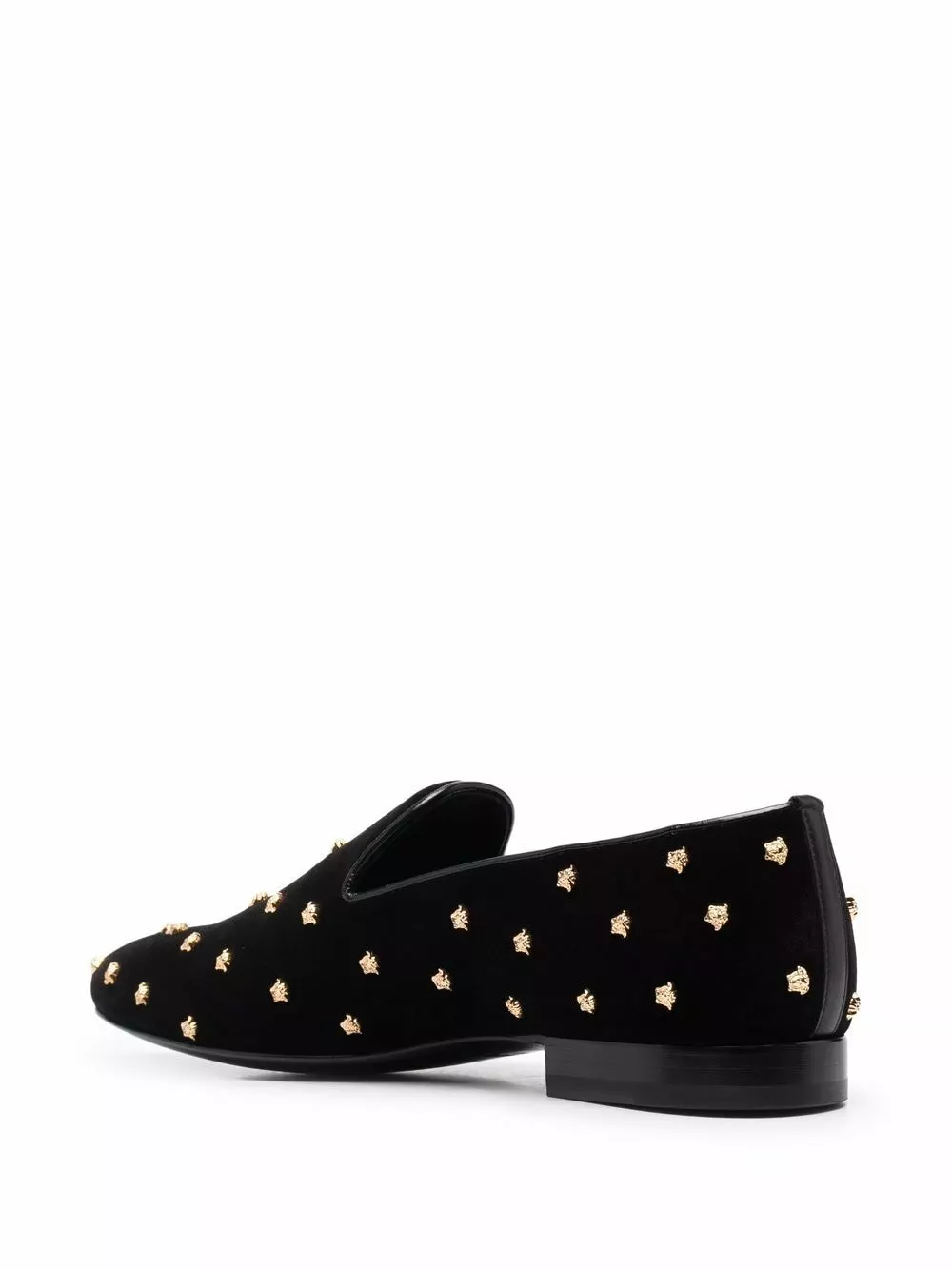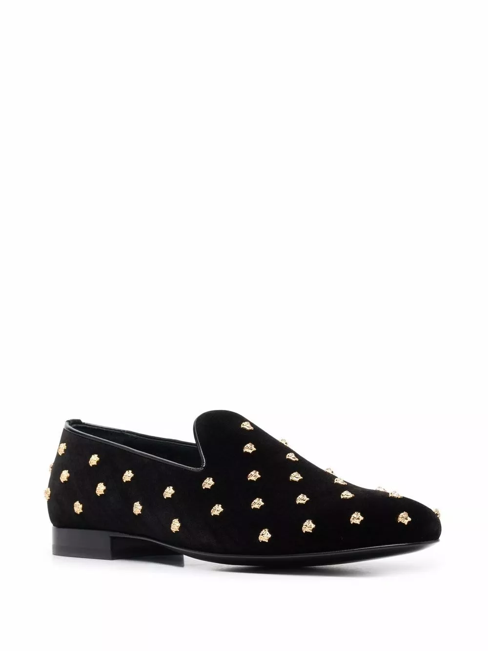 Versace’s Italian-crafted loafers are fabricated in tactile velvet and feature all-over Medusa head studs. Embodying the brands luxe spirit, the almond toe silhouette is trimmed in leather.