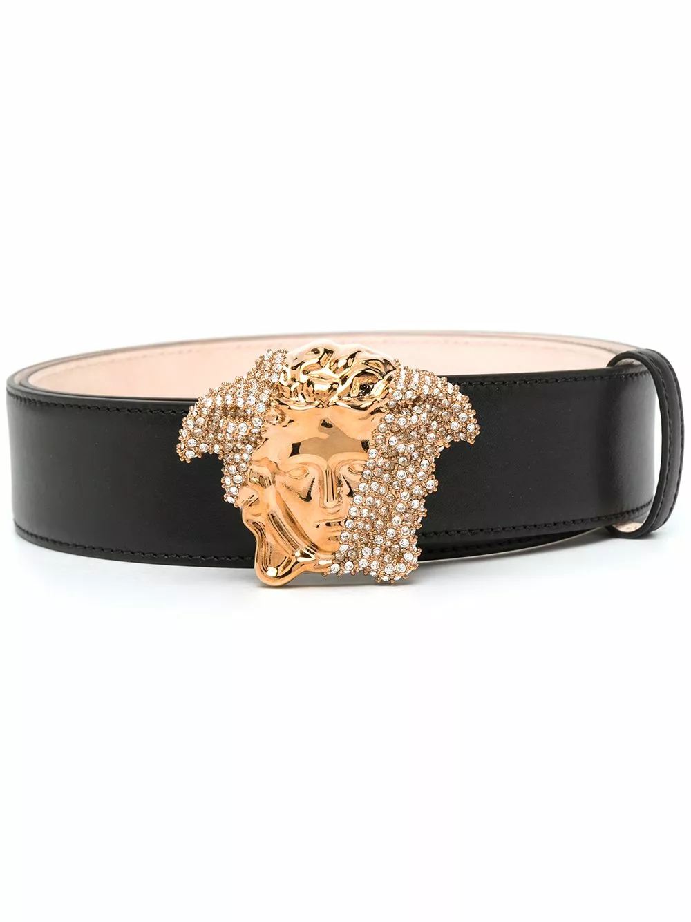 Pull your look together, literally and figuratively, with this Palazzo Dia crystal belt from Versace. Crafted from leather and designed with a crystal-embellished Medusa buckle fastening, this sleek accessory is the perfect finishing touch to your carefully-curated ensemble.