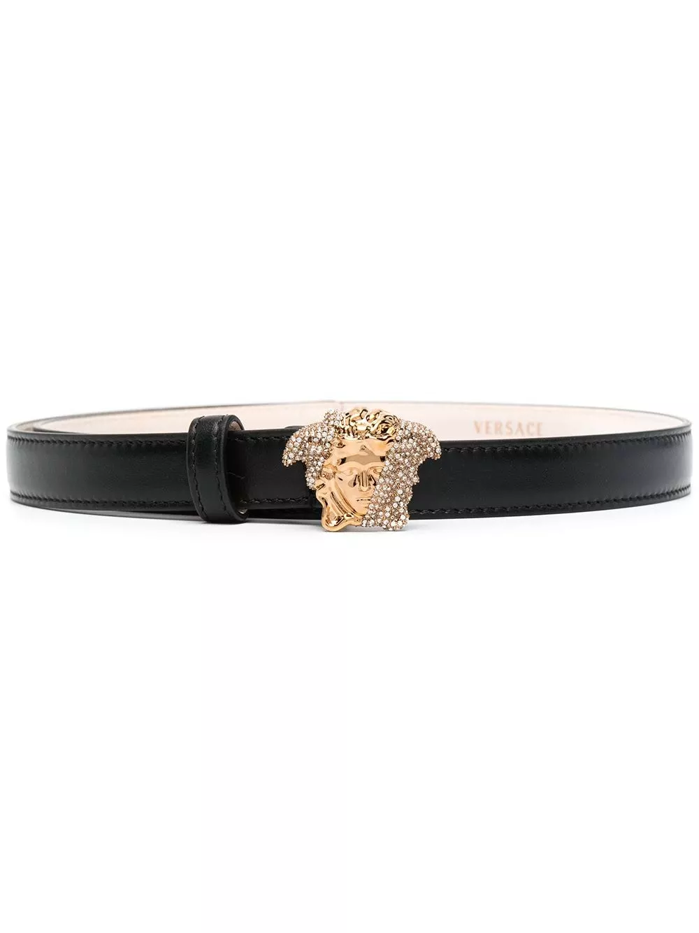 Incorporate Italian elegance into your ensemble. Featuring a crystal-embellished Medusa buckle, this Palazzo Dia belt was designed to elevate any outfit you decide to pair it with. Versace decadence at its finest.