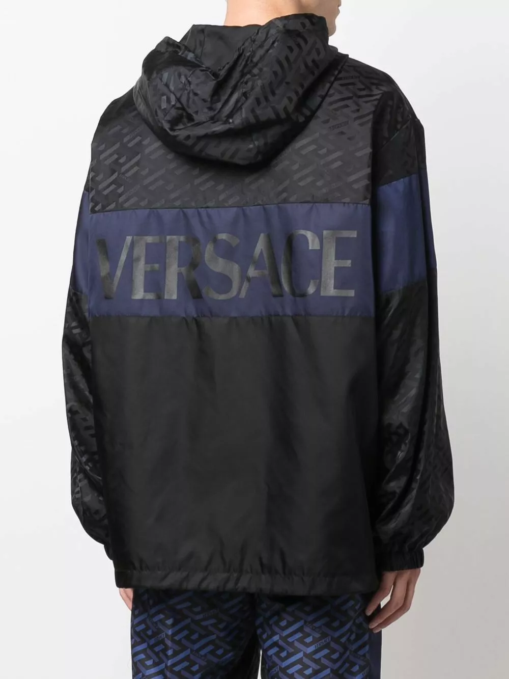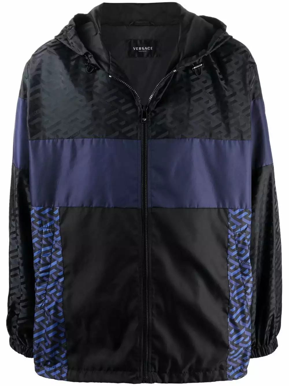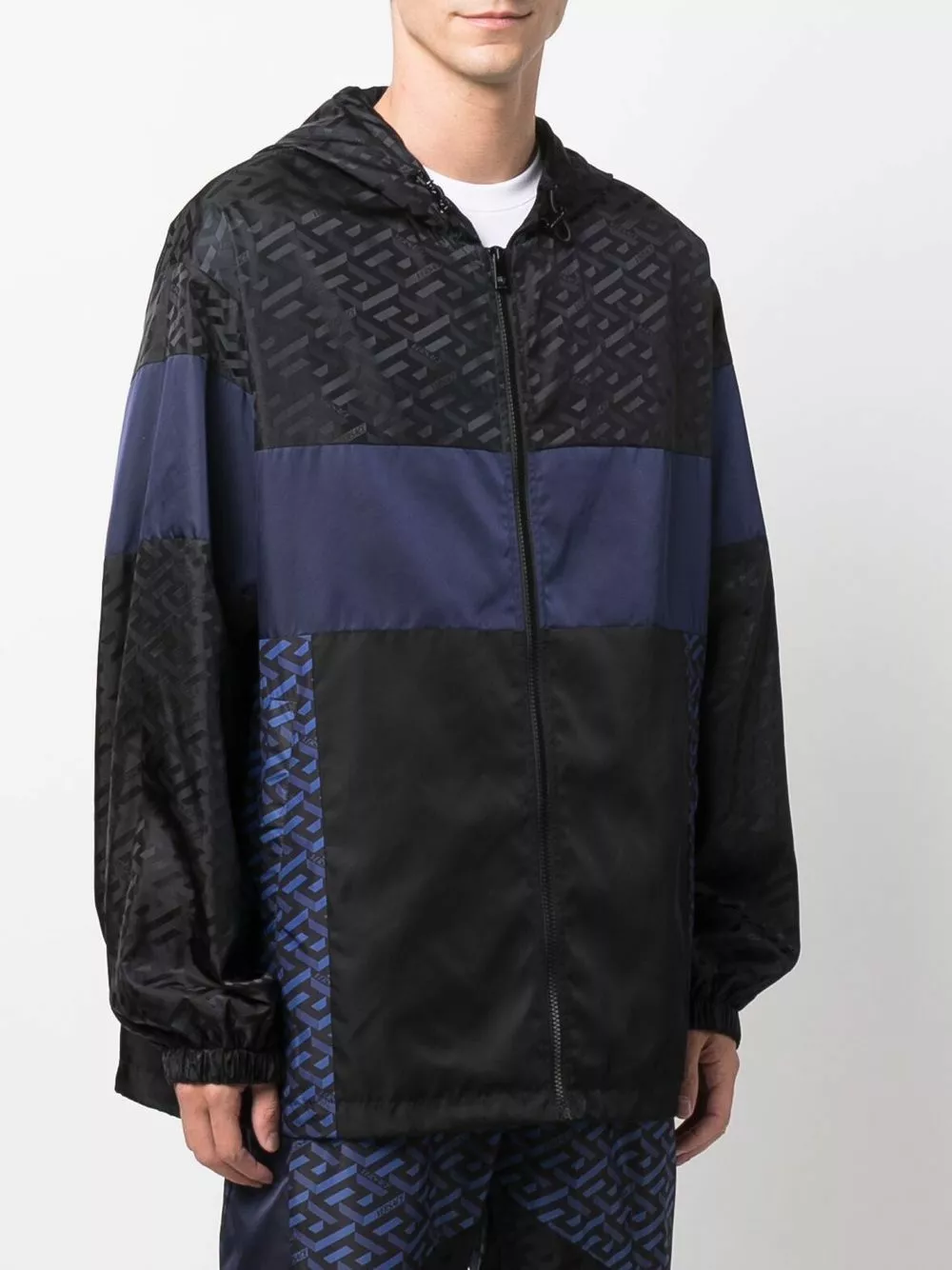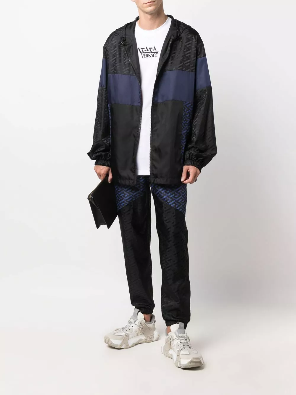 Pioneers of recognisable motifs, Versace are also champions of the logomania trend. This track jacket features an all-over geometric logo-print in a panelled design and logo-lettering is emblazoned on the back for added boldness.