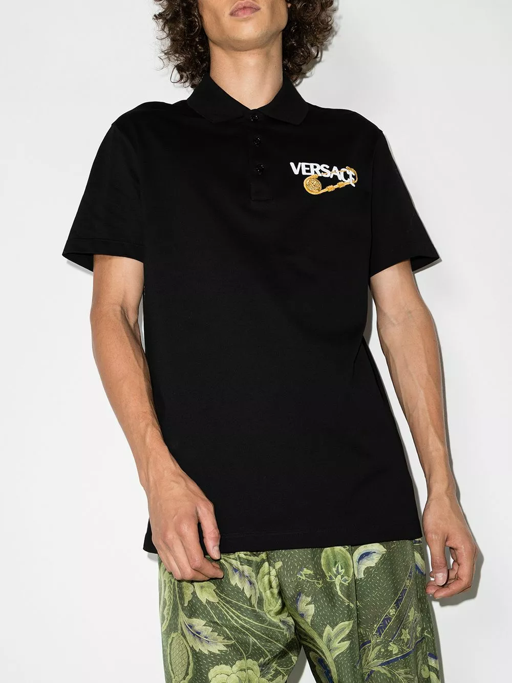 Versace transforms the classic polo shirt by adding an iconic house code. Crafted from black cotton and cut to a traditional silhouette – note the collar and button placket – this piece is adorned with the brand’s signature Medusa Safety Pin motif at the chest.