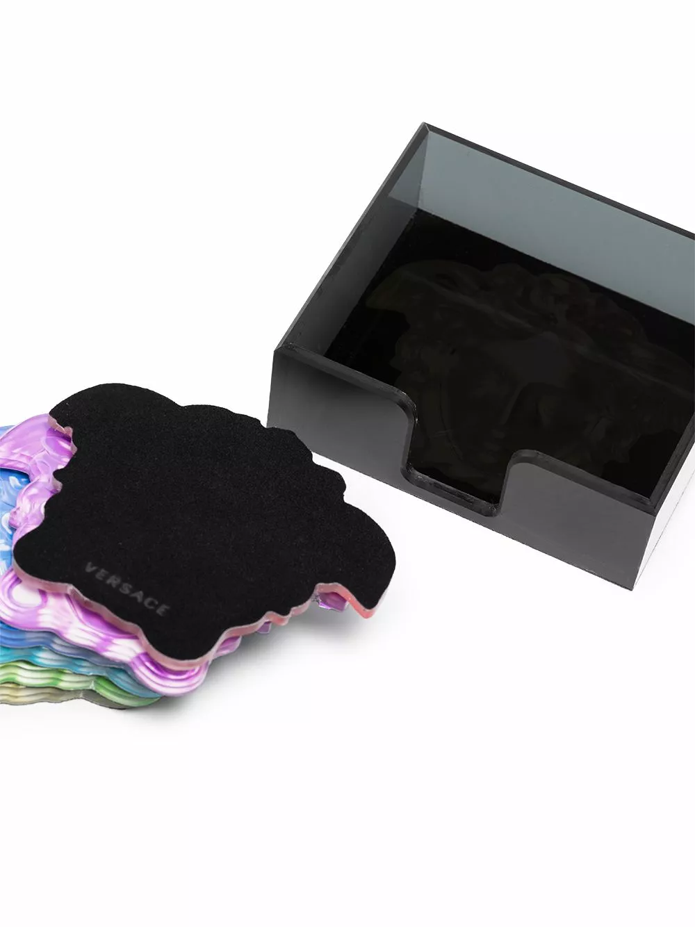Versace extends its iconic Medusa head motif to its homeware collection by creating a colourful set of 6 coasters shaped like the famous Greek figure.