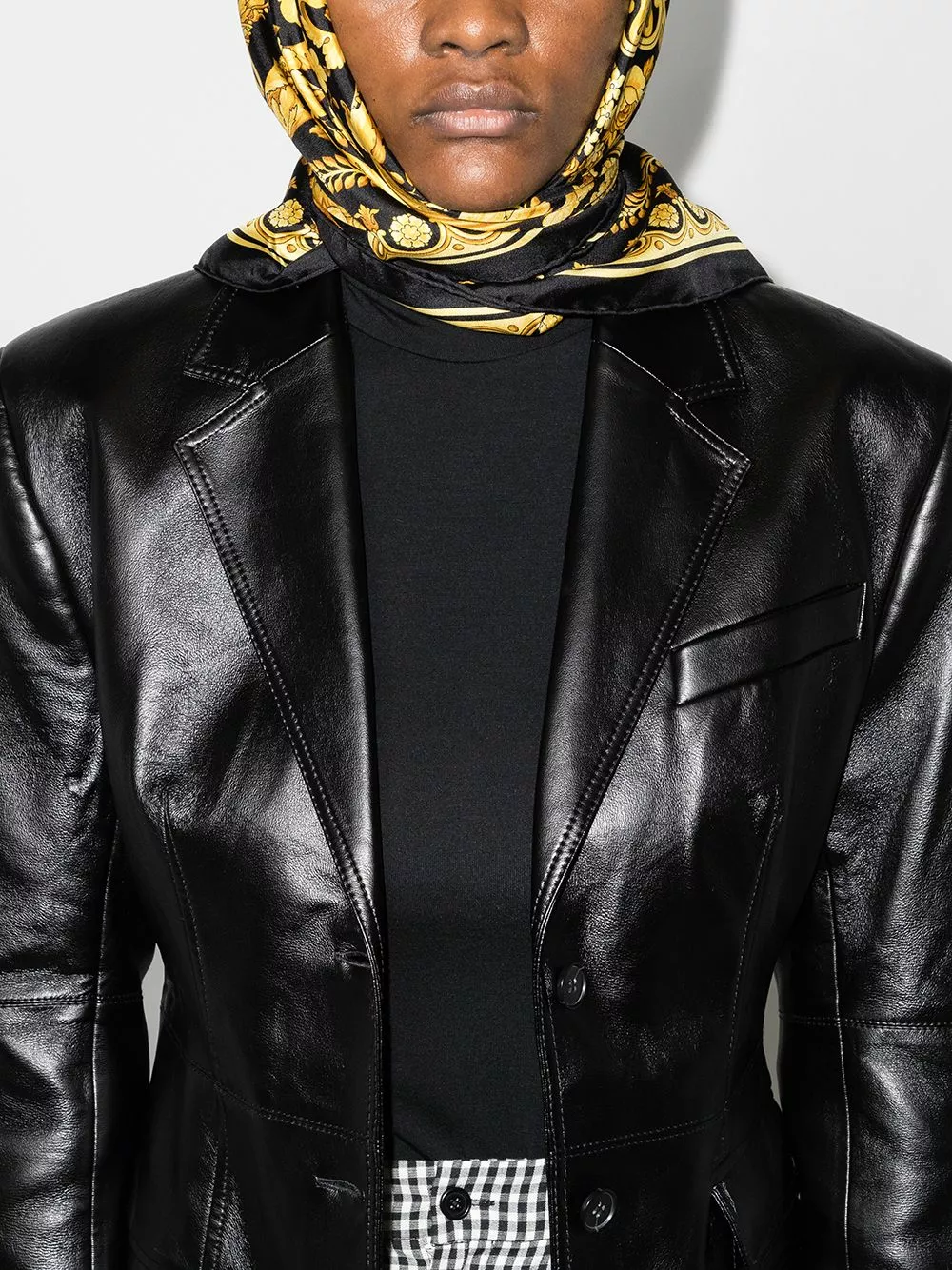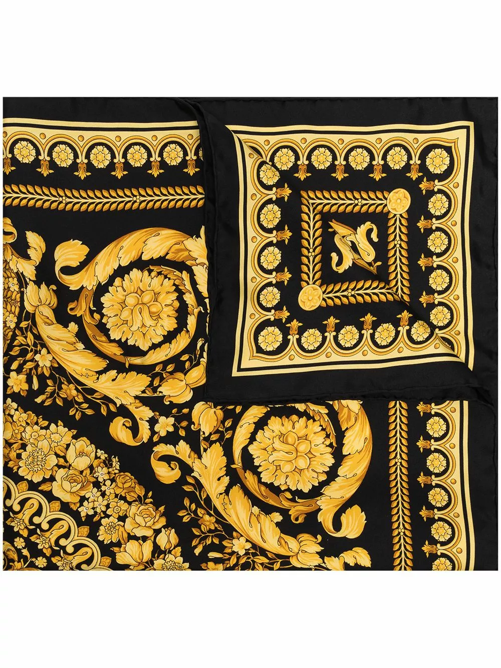 Black and Yellow Silk Foulard Signature Scarf from Versace.