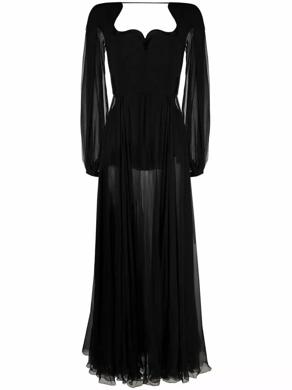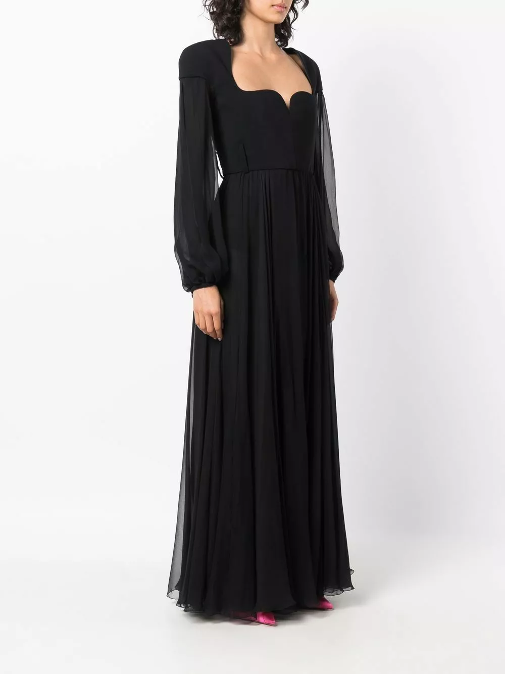 Staying true to Versace’s classic sense of elegance, this maxi dress embodies typical Italian refinement. With a sweetheart neckline, this piece is complemented with a sheer overlay for added charm.