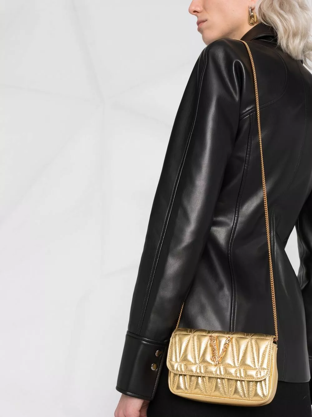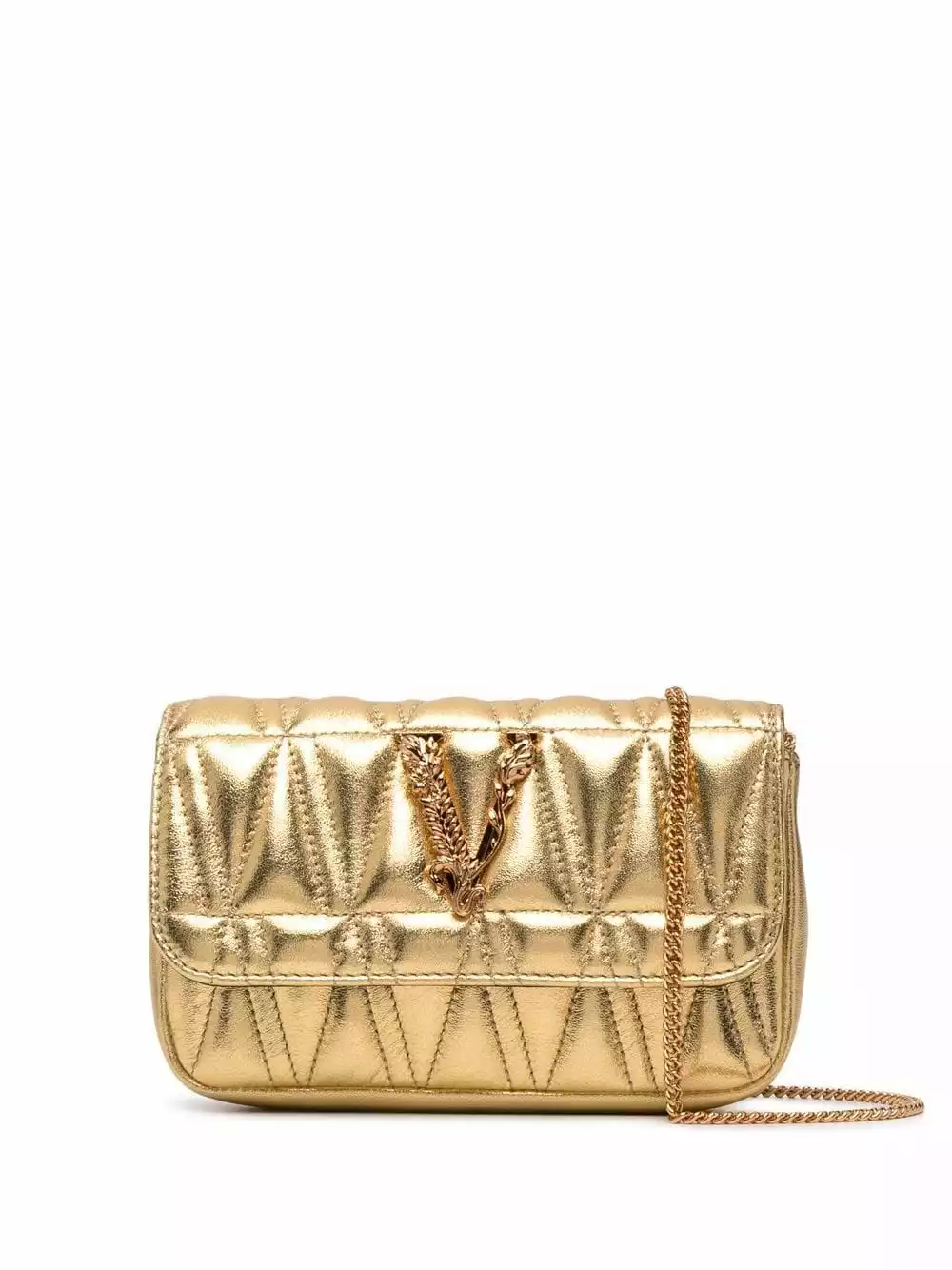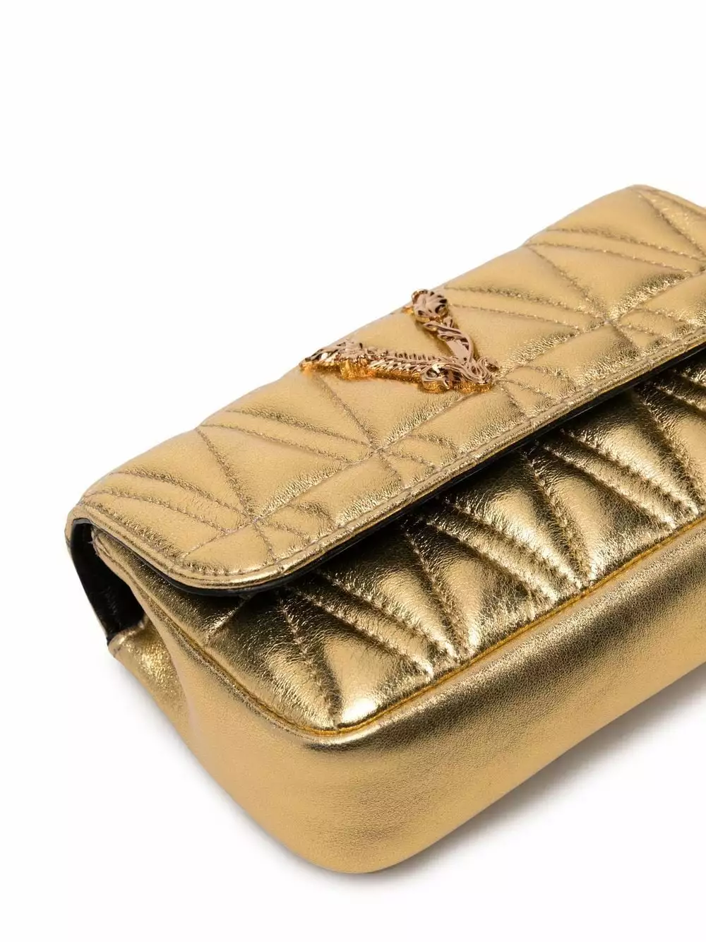 Detailed with a signature Barocco V gold logo on the front, this Versace clutch bag is crafted in soft lambskin with a V-Pattern quilting. A detachable chain-link shoulder strap allows for a multi-wear use.
