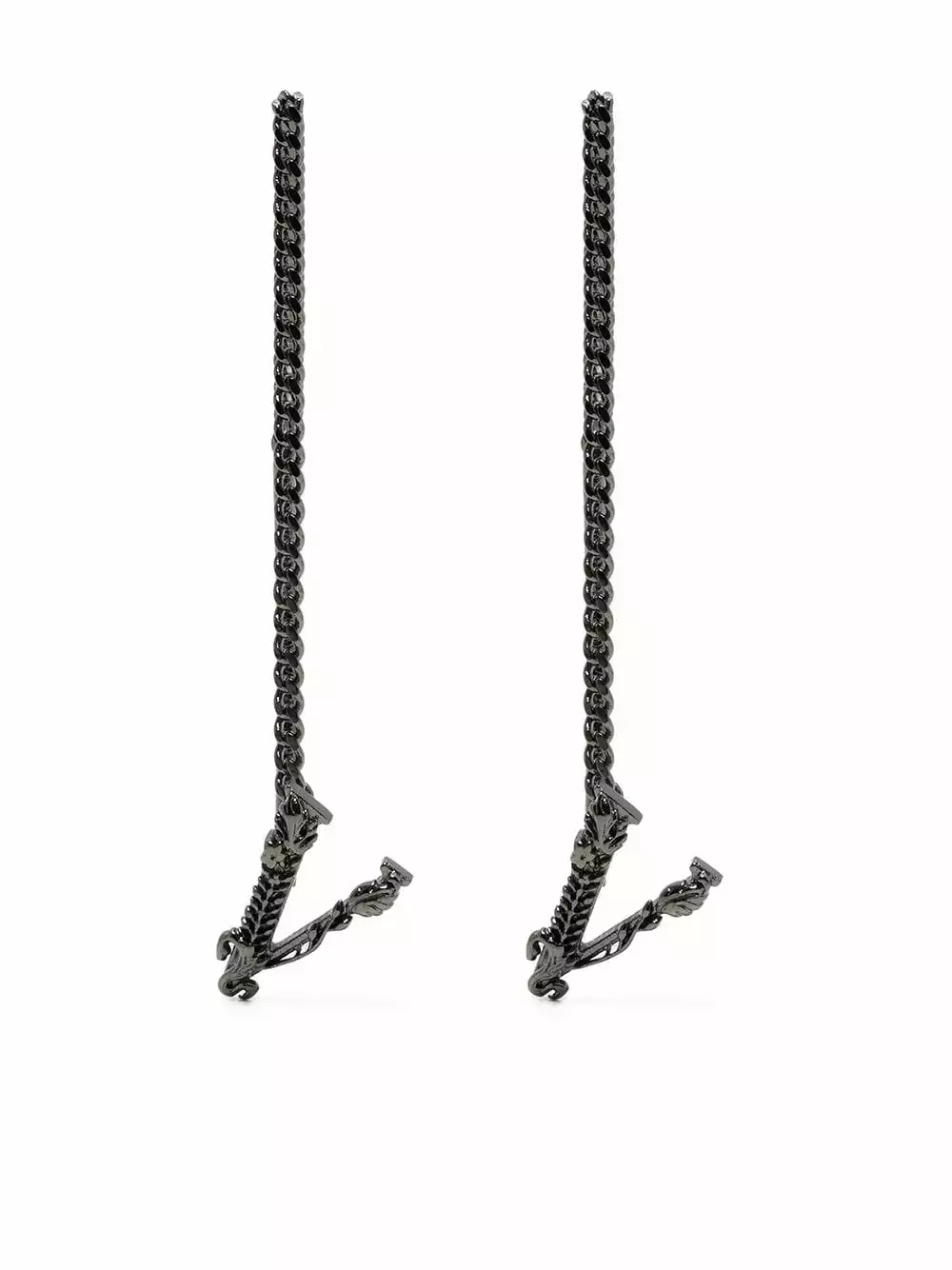 Combining key Versace elements, these earrings will add a point of interest to any look. Constructed from brass in a silver-tone hue, these earrings are set on a chain-link detailing and finished with a Barocco-detailed V.