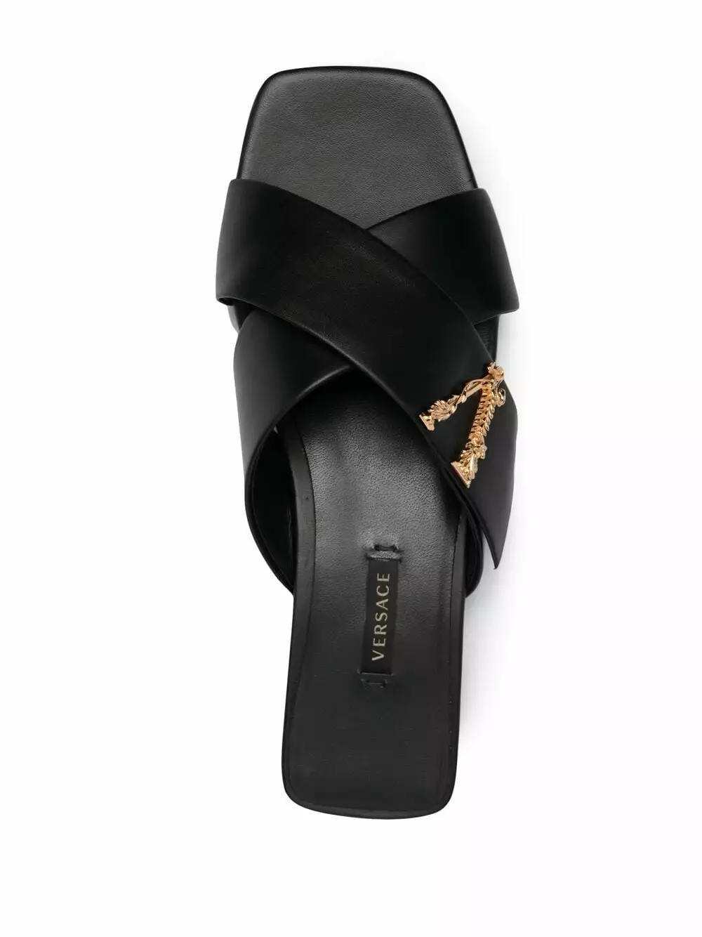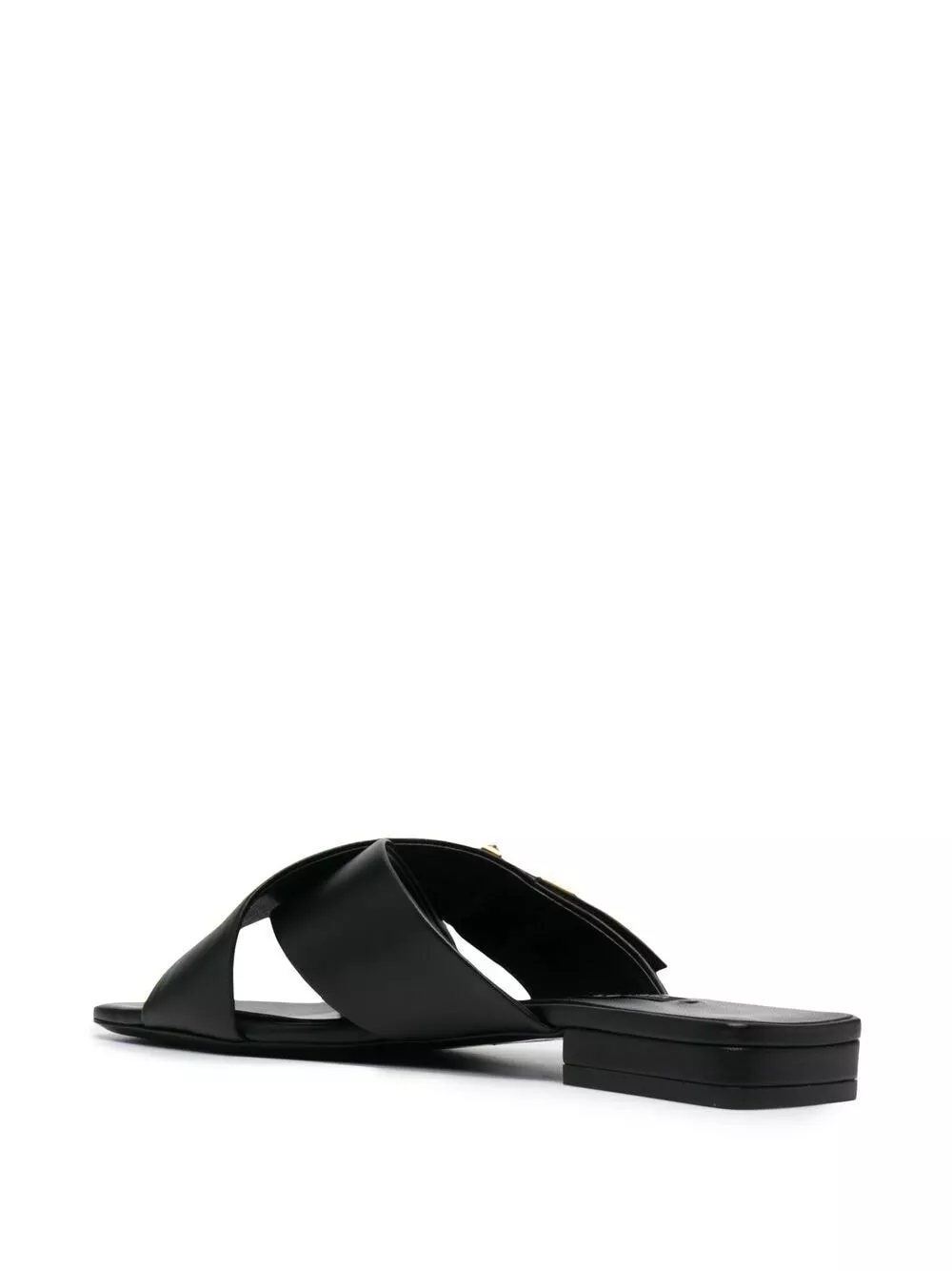 Laid-back days never looked so good. Crafted from calf leather, these black slide sandals from Versace are detailed with a gold-tone Virtus V plaque at the upper. Summer, we’re ready.