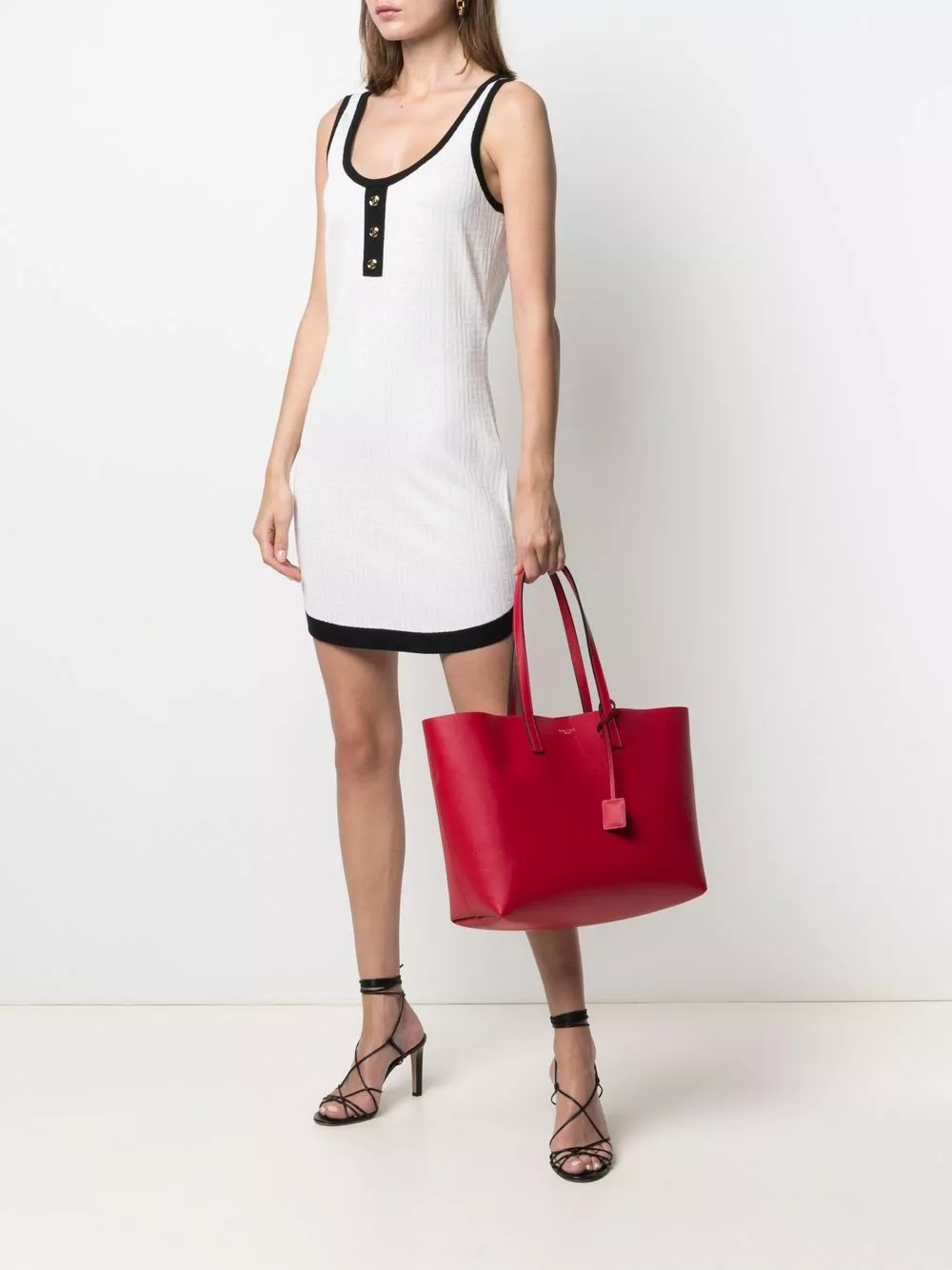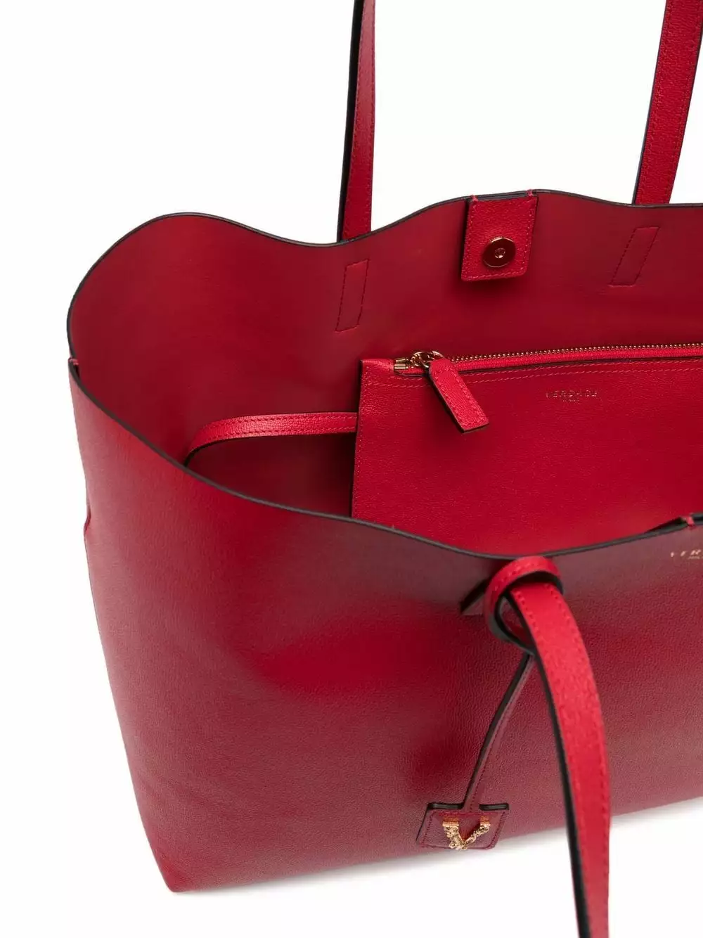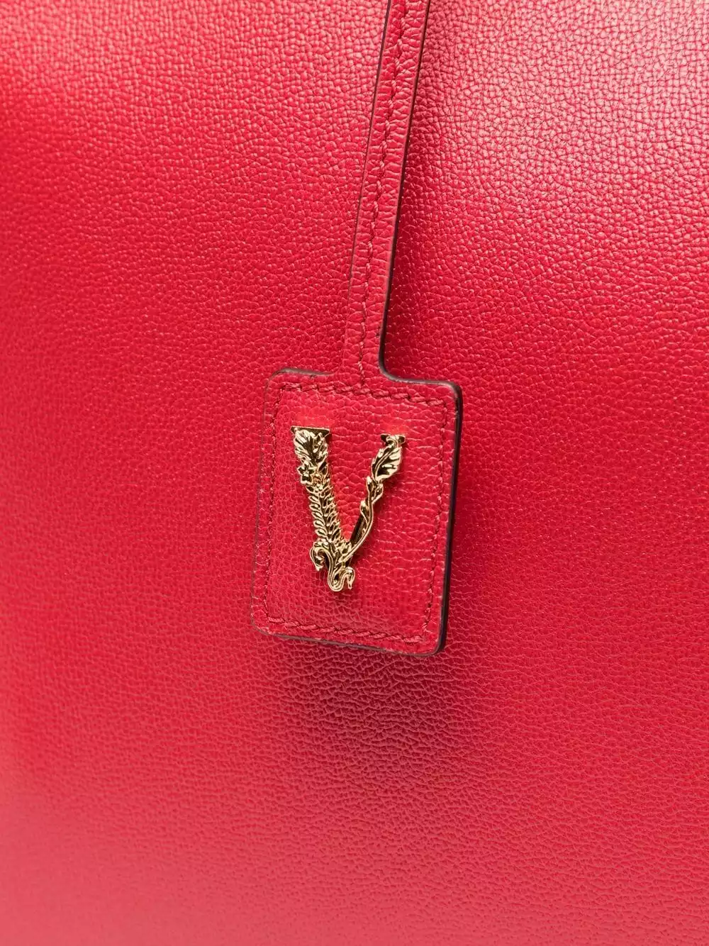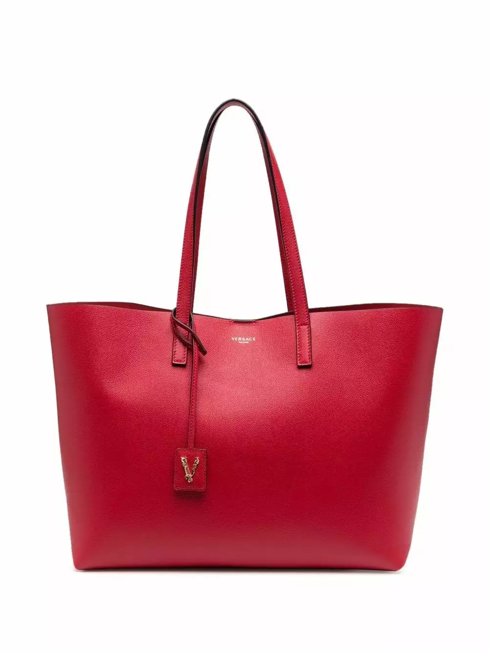 Versace keeps things simple with this supple leather tote bag. The understated design is detailed with a subtle debossed logo and a leather tag embellished with gold-tone Virtus hardware – a motif used by the brand to represent courage, strength and character.
