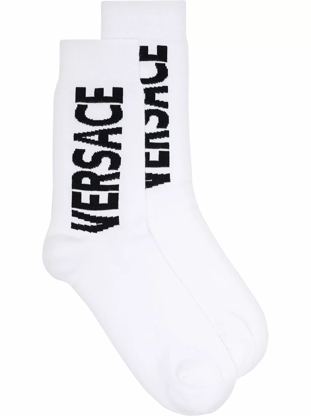 White and black logo printed socks from Versace featuring a ribbed design and an ankle length. Socks and Hosiery must be returned in its original unopened packaging.